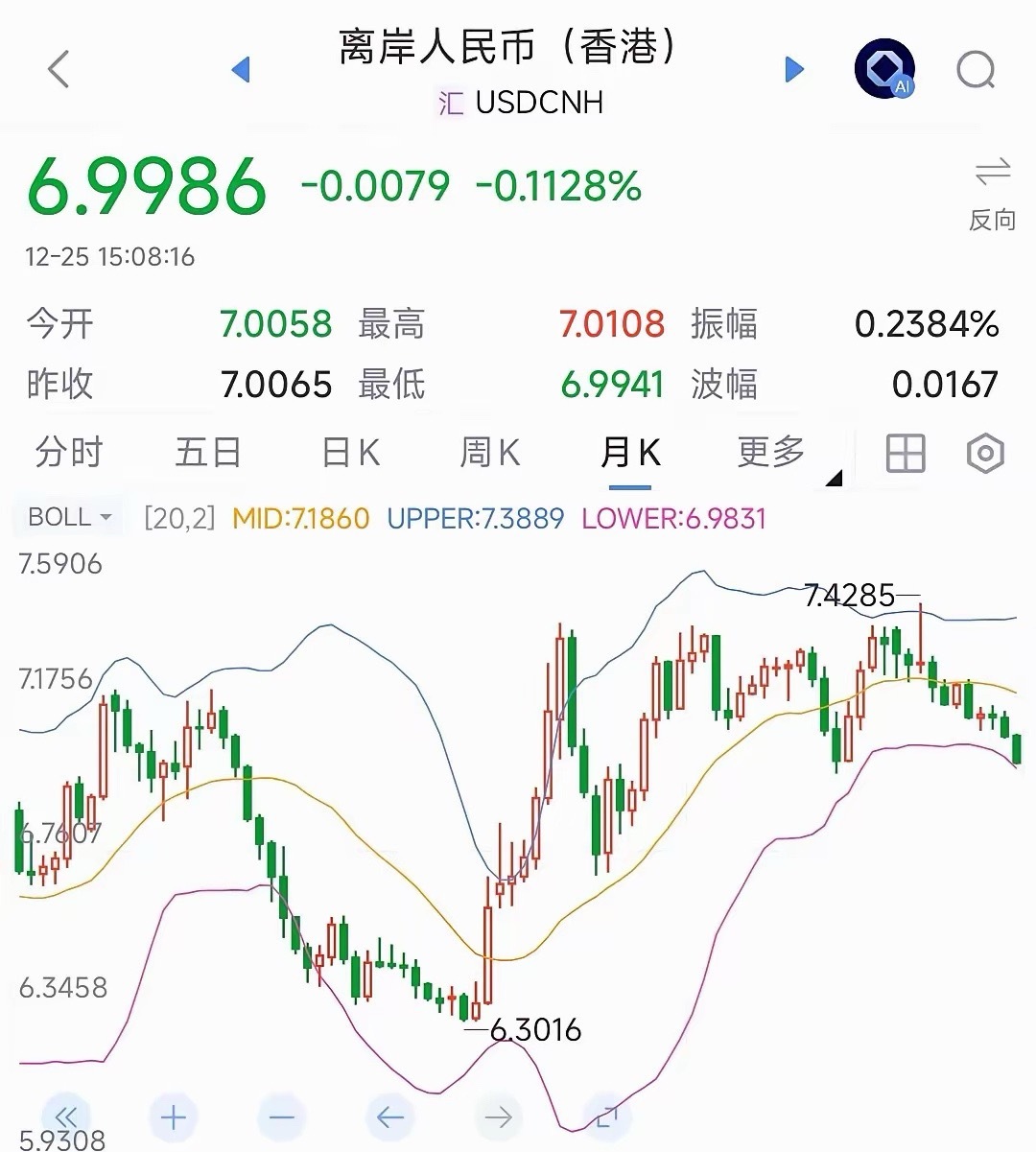 时隔15个月,人民币再次破7,中国资产大面积升值人民币升值对于资本市场来说就是一个大利好,外资会大举的进入买入中国资产,这也是A股现在这么强势的原因,目前已经连续7天收红盘,这在历史上面都是很少见的。人民币的升值其实是被动的,主要原因是美元得持续走弱,特朗普的政策迫使美元持续下跌,造成各国货币升值。人民币升值对于出口来说并不是一个好消息,报价能力减弱,需外汇衍生品锁汇。但对于采购外国商品来说是一个利好,购买力大大增加。