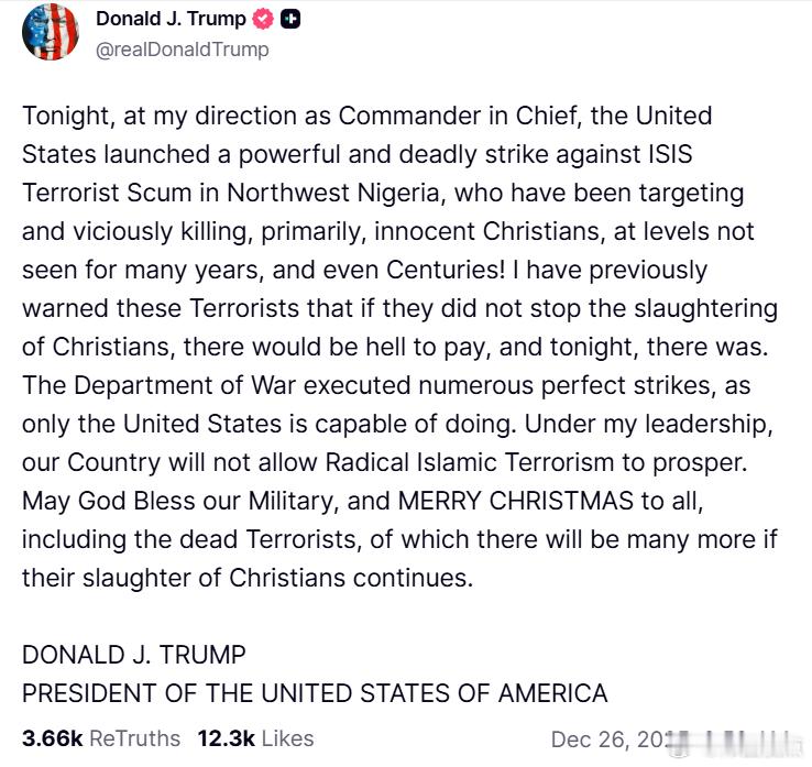 特朗普总统12月25日:今晚,作为三军总司令,根据我的指示,美国对尼日利亚西北部的ISIS恐布分子人渣发动了一次强力且致命的打击。这些恐布分子主要针对无辜的基督徙,残酷S害,手段之凶残是多年来乃至几个世纪未见的!我此前已经警告过这些恐布分子,如果他们不停止屠S基督徙,将自食恶果。今晚,他们尝到了后果。战争部执行了多次完美打击,只有美国才能做到这种水平。在我的领导下,我们的国家绝不会允许激进伊斯兰恐布主义猖獗。愿天佑我们的军队,祝大家圣诞快乐——包括那些S去的恐布分子,如果他们继续屠S基督徙,将会有更多后果。