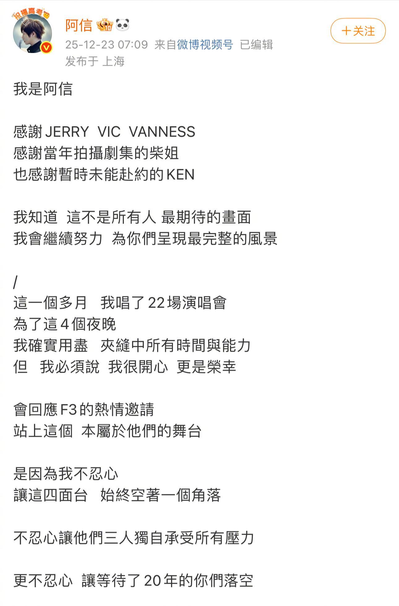 【#朱孝天致歉#:因情绪失控,发表有失妥当的言论】#朱孝天澄清声明# 12月25日晚,针对先前“爆料”五月天所属经纪公司“相信音乐”的相关言论,朱孝天发布澄清声明并致歉,表示因情绪失控,在与他人私信沟通中发表了有失妥当的言论,向公众致以诚挚的歉意。同时他表示,其此前提及“国台办”的相关言论,与实际情况并不相符,特此作出澄清并表达诚挚歉意。朱孝天声明全文如下:自今年九月“F4合体”相关事件发生以来,我持续遭受网络暴力侵扰,精神承受巨大压力。近期这一情况愈演愈烈,不仅严重干扰了我的正常工作节奏,更无端波及家人的平静生活,让我身心俱疲。在持续的恶意攻击私信裹挟下,我因情绪失控,在与他人私信沟通中发表了有失妥当的言论。相关言论后续引发了不必要的揣测,客观上占用了公共资源,在此我向公众致以诚挚的歉意。事件引发争议后,我深刻反思了自身言行,面对纷扰时,我未能以理性态度克制情绪,亦未能以妥当方式妥善应对,做出了错误的示范,再次深表歉意。此外,本人此前提及“国台办”的相关言论,与实际情况并不相符,特此作出澄清并表达诚挚歉意。感谢各界的理性关注与监督,再次诚恳致歉。同时,恳请大家尊重个人及家人隐私,共同维护清朗的网络空间。后续我会更谨言慎行,也请大家理性看待网络言论。热搜中的截图显示,朱孝天在聊天界面称,五月天所属经纪公司“相信音乐”涉嫌勾结黄牛炒票、通过跨境贸易公司转移资金以逃漏税、要求艺人假唱等多项违规行为,并称自己已配合相关部门调查,“上面已经开始调查这些事情了,应该很快就要行动了”。(南都N视频记者 钟欣)