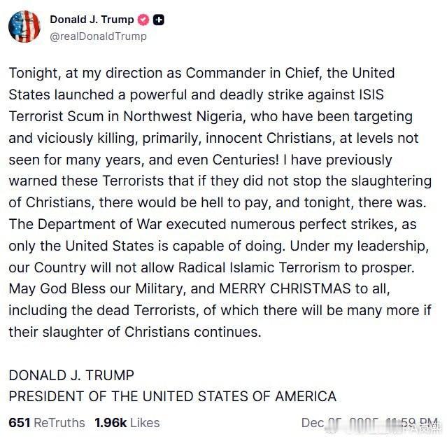 为回应ISIS持续迫害和杀害基督徒的行为,特朗普总统宣布对尼日利亚西北部的ISIS目标发动空袭。 “今晚,在我作为三军统帅的指示下,美国对尼日利亚西北部的ISIS恐怖分子发动了一次强有力的致命打击。这些恐怖分子以前所未有的规模,残忍地杀害无辜的基督徒,其规模之大,多年来甚至几个世纪以来都未曾见过! 我此前曾警告这些恐怖分子,如果他们不停止屠杀基督徒,必将付出惨痛的代价。今晚,他们的惨剧得到了应有的惩罚。 美国战争部执行了多次精准的打击行动,这只有美国才能做到。在我的领导下,我国绝不允许极端伊斯兰恐怖主义得逞。 愿上帝保佑我们的军队,祝愿所有人圣诞快乐,也祝愿那些被打死的恐怖分子圣诞快乐。如果他们继续屠杀基督徒,死的人还会更多。” 美国战争部公布了美国海军驱逐舰向尼日利亚西北部的索博托州目标发射“战斧”巡航导弹的视频。尼日利亚外交部也确认了美军的打击行动并表示美军得到了尼日利亚政府的许可和合作。