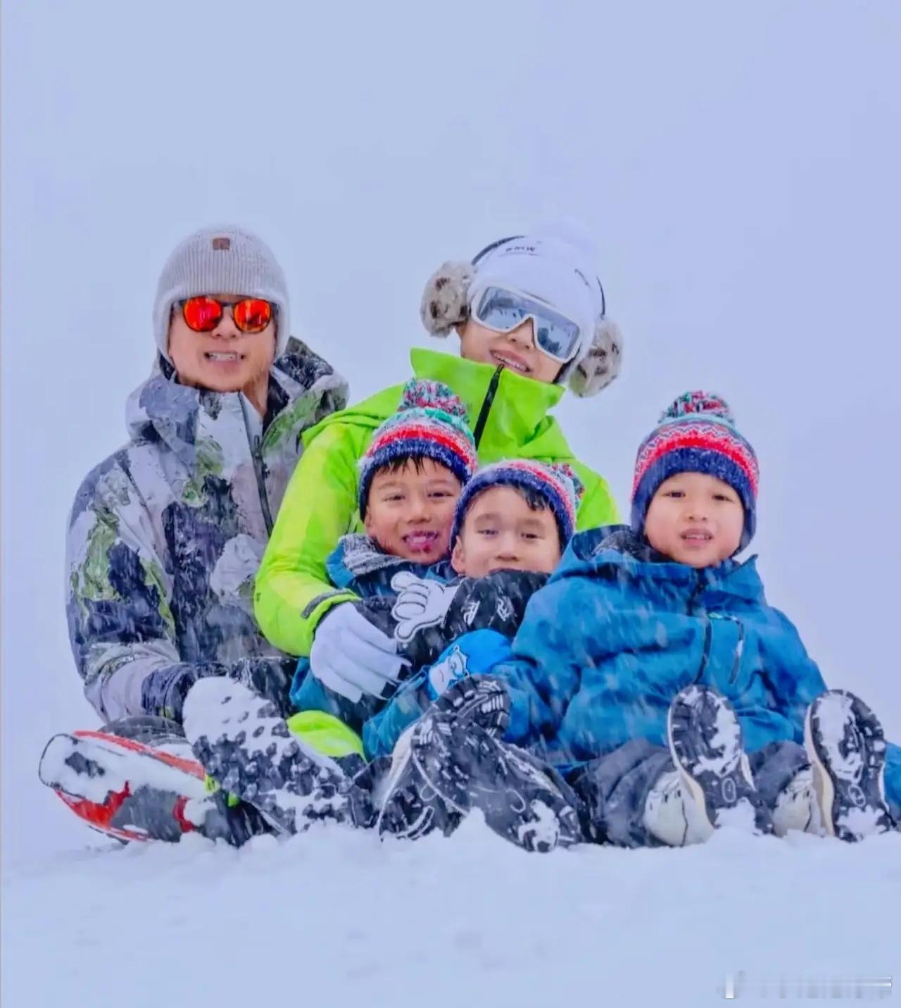 胡杏儿晒出全家滑雪照片,这三个大儿子好可爱!她真的是生儿子命,三个儿子加上老公,家里简直就像男生宿舍!