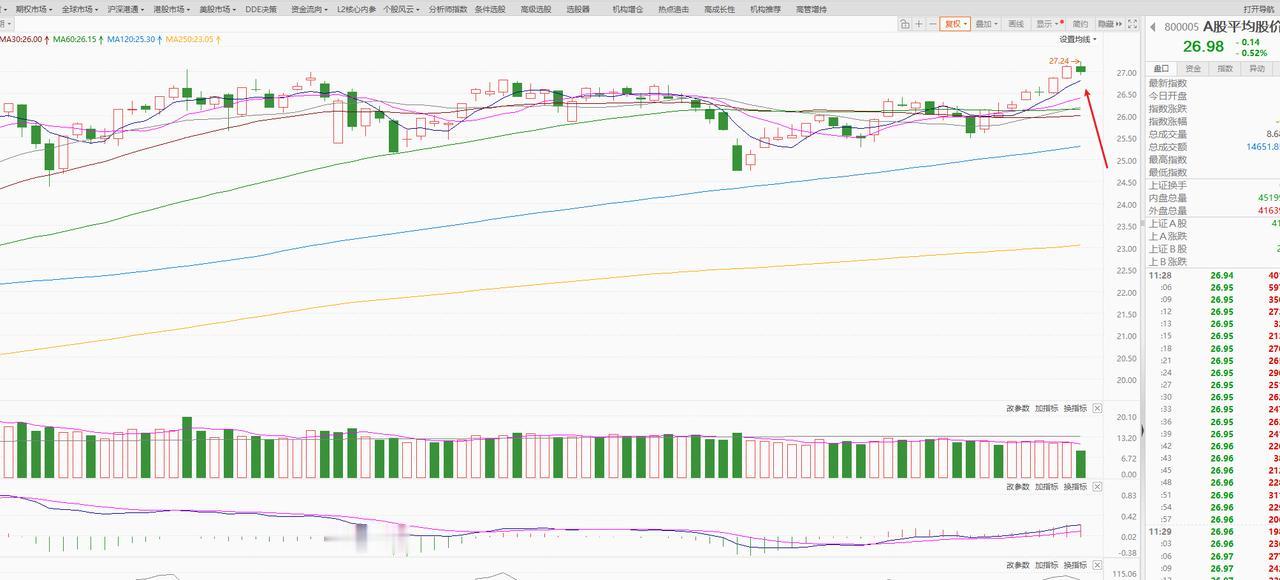 临近中午跳水,近4000家下跌该如何看? 抖抖身子,甩掉“尘飞”,结构行情继续 昨日平均价指数新高,说明整体行情属于趋势向上的范围 近4个月的横盘震荡,说明是新一波行情的起点 不要小看平均价只是新高一点,但不要小看意义 后续的下跌不会新低了。中期调整也就没了。 当下这个阶段指数波动较小,但板块之间轮动表现 昨日已经7连阳,但很少个股有7连阳的,大部分只有2-3根阳线,这就是轮动的意义 后续指数空间还会有,这一波先看4034的新高。然后才看调整 现在只希望这个周期指数走的更慢一点,那赚钱效应就会更好一些 临近中午的跳水翻绿,其实是好事, 今日大盘大部分时间指数表现不错,但平均价指数就是震荡 主要是让指数沿5日线攻击,这样就防止了较大的调整,用盘中多次震荡消化一次明显的下跌。 很多人等指数明显下来,那是等不到的。盘中这样的小波动也不会入 等4034新高后再买,就明显抬高成本了。