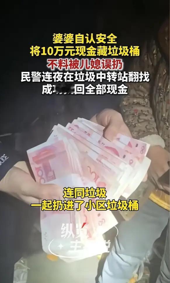 “防不胜防!”12月21日,湖北武汉,一女子取出10万存款,为了安全,她悄悄藏进家里的垃圾桶里面,不料儿媳打扫卫生时,竟把装钱的垃圾袋扔到了楼下的公共垃圾桶里,等女子一家再去找时,发现垃圾桶已经被人清理。网友:还不如放枕头底下! 这笔钱是刘女士刚刚到期的存款,她特地从银行取出来,准备转存或者另作他用。为了避开可能的小偷,她觉得最危险的地方就是最安全的地方,于是用帆布袋仔细包好现金,外面还裹了件衬衣,悄悄塞进厨房垃圾桶的底部。 第二天一大早,儿媳一起床就忙着打扫屋子。她看到垃圾桶里的袋子,压根没多想,顺手就和其他垃圾一起打包,下楼扔进了小区的公共垃圾桶。整整一个白天,全家没人察觉到任何异常。 直到晚上6点多,刘女士回到家,下意识地去查看她的“秘密金库”,才发现钱不见了。一番询问之下,真相大白,全家人都急坏了。他们打着手电筒,在小区垃圾桶里翻了个底朝天,但那个帆布袋早已不见踪影。 心急如焚的一家人最后只能报警求助,民警接到报警后,立刻带着队员赶到现场。他们马上联系了小区的环卫工人,得知那批垃圾已经被运到了附近的垃圾中转站。中转站里,打包好的垃圾袋堆成了小山。而且晚上站内没有照明,大家只能靠着几支手电筒和手机发出的微弱灯光进行寻找。一开始,因为刘女士太过焦急,误把装钱的“帆布袋”说成了“透明塑料袋”,导致第一轮搜寻一无所获。 民警没有放弃,他组织在场的人对中转站里已经打包的垃圾袋进行逐一开袋检查。晚上8点14分,陈操终于翻找到了一个帆布袋,打开一看,里面正是捆扎得整整齐齐的十万元现金。经过清点,钱一分不少。刘女士握着失而复得的现金,激动得不停道谢。 看来如何安全地存放家庭应急现金,确实是不少人心里的一个难题。银行储蓄或许是最稳妥的方式之一。这次事件总算有个圆满的结局,多亏了认真负责的民警们。 各位读者你们怎么看?欢迎在评论区讨论。
