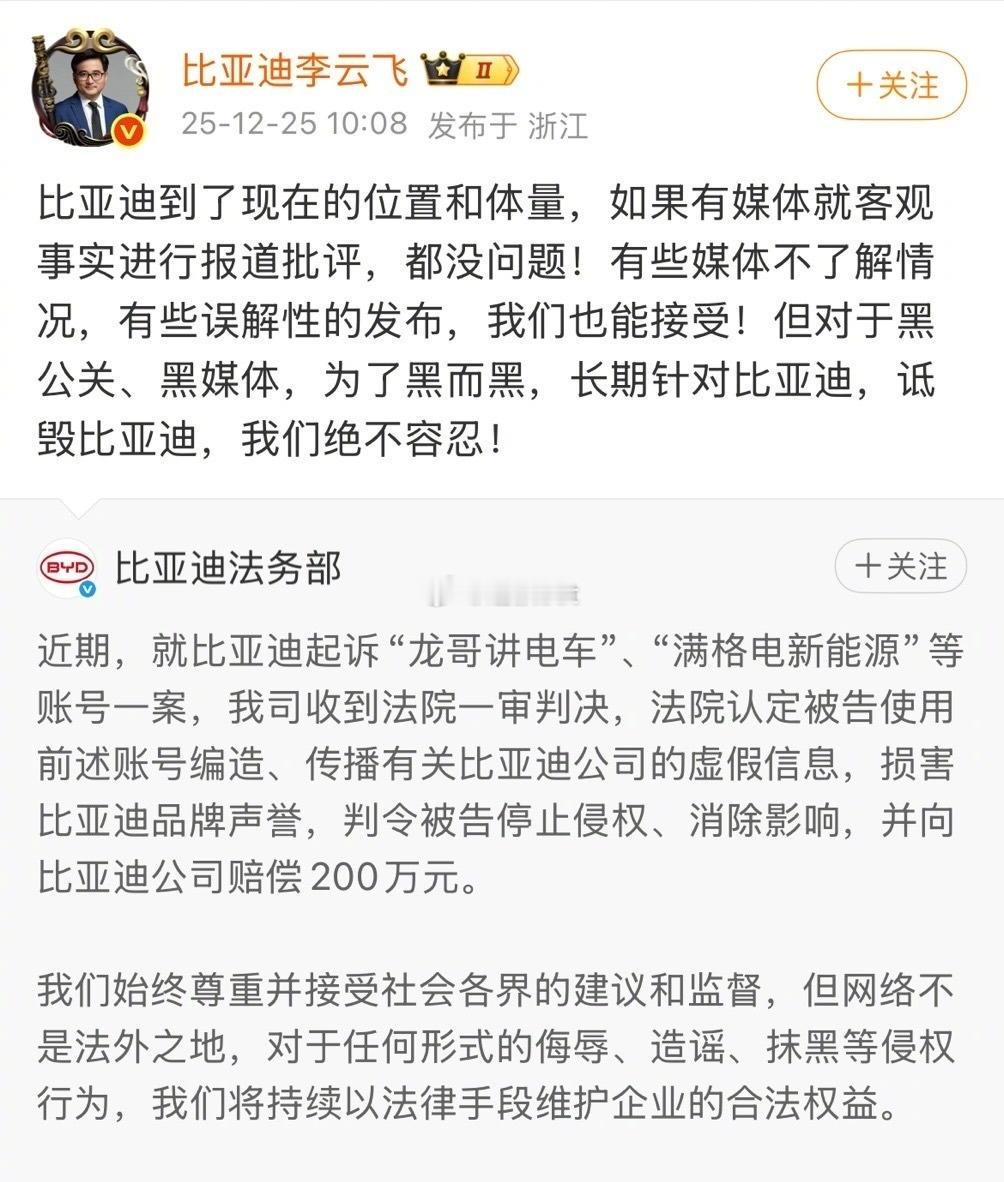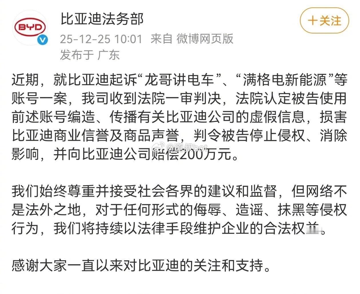 “龙哥讲电车”、“满格电新能源”等自媒体,被判赔偿比亚迪200万元,恭喜比亚迪维权成功,正义之声大快人心!看谁还敢造谣抹黑?法院判决自媒体赔偿比亚迪200万元