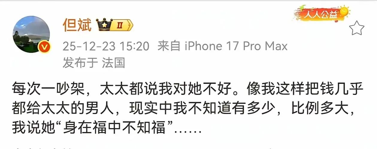 拥有百亿身家的私募投资大佬但斌也被老婆嫌弃了! 夫妻感情的事把这样的大佬都难住了,普通人咋办? 有钱也不行,没钱更不行! 没钱的时刻陪在身边,要被嫌弃没出息; 有钱的光给钱,要被抱怨不能陪伴; 有钱有陪伴了,又要有情绪价值和灵魂共鸣; 等到钱、陪伴、情绪价值和灵魂共鸣之后还要有持续好的颜值和身体。 就算神仙来了也不行,因为不能同生不能共死! 苦逼的男人,反正总有一款适合你! 私募大佬但斌的赚钱能力 男人 夫妻 夫妻感情