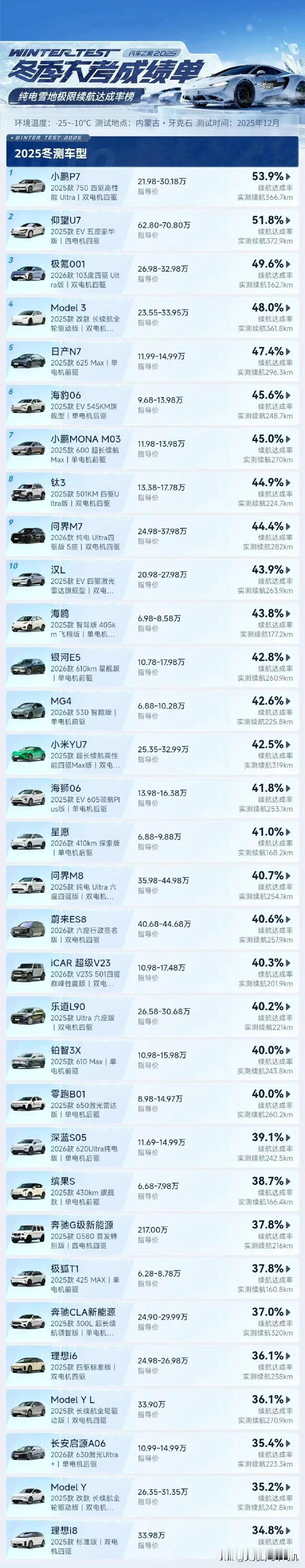 想不到浓眉大眼的小鹏,冬季达成率居然第一名! 达成率倒数第一名居然是理想i8,仅有34.8%,不过也有250.3公里续航。 汽车之家冬测续航榜,零下十几二十度,最差的只有166公里续航,算勉强够用吧。 1、省钱不怕麻烦(两三天充电一次),纯电勉强够用。 2、不差钱,增程或者插混更放心。 3、有个疑问,就是低温的情况下,会不会对电池造成不可逆的损伤呢? ​​​