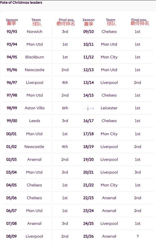 在英超迄今为止的33个完整赛季中,有17次圣诞冠军最终捧杯,另有16次他们与冠军失之交臂。
