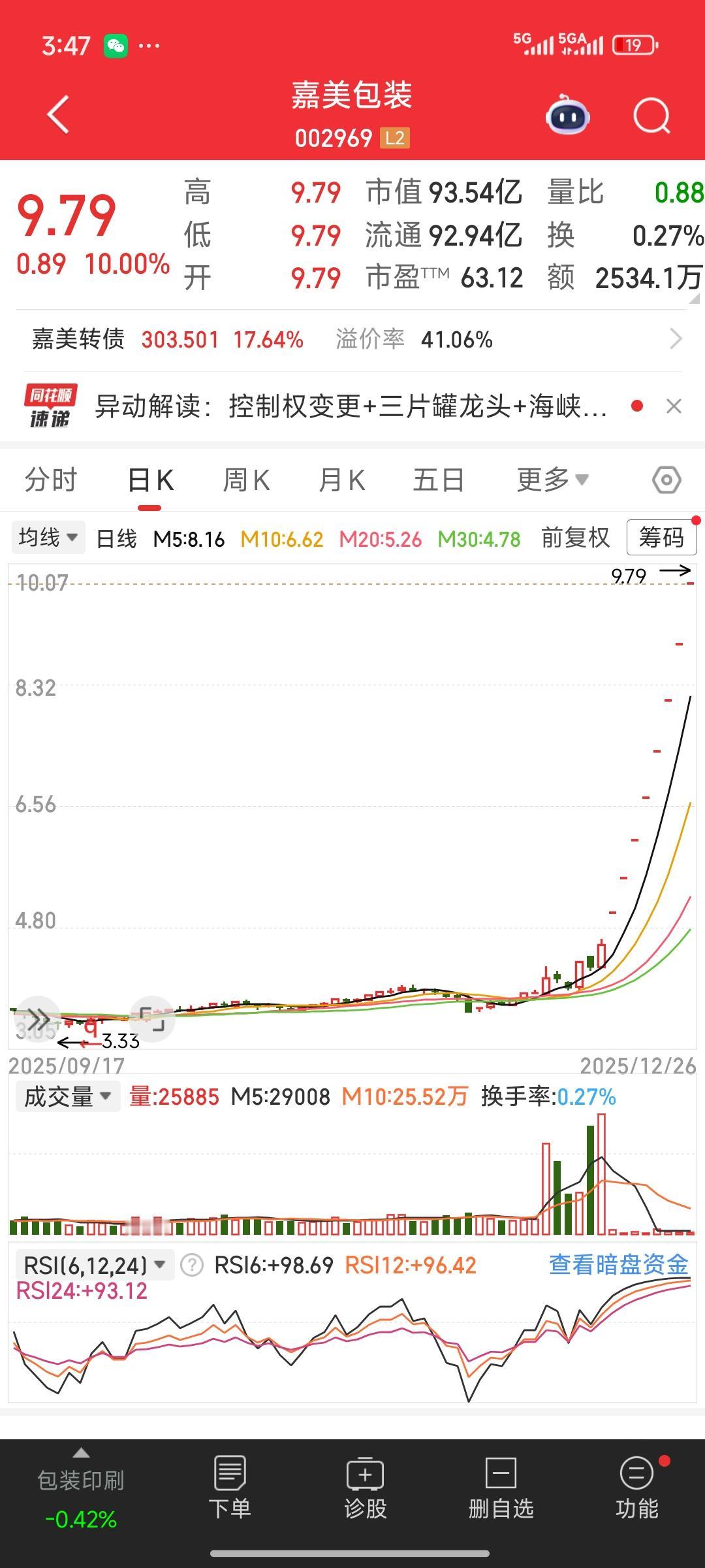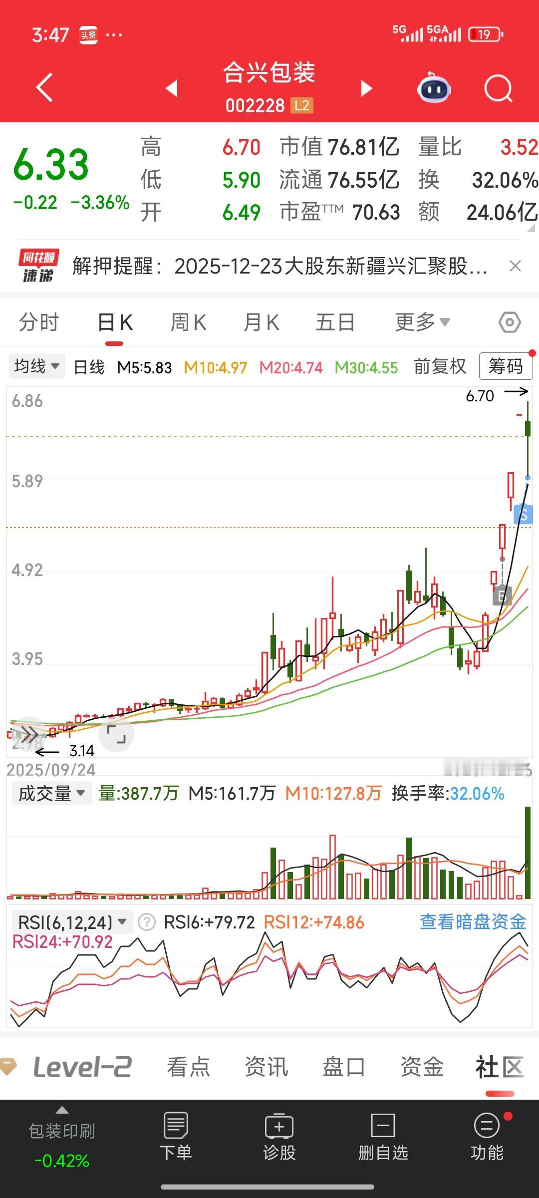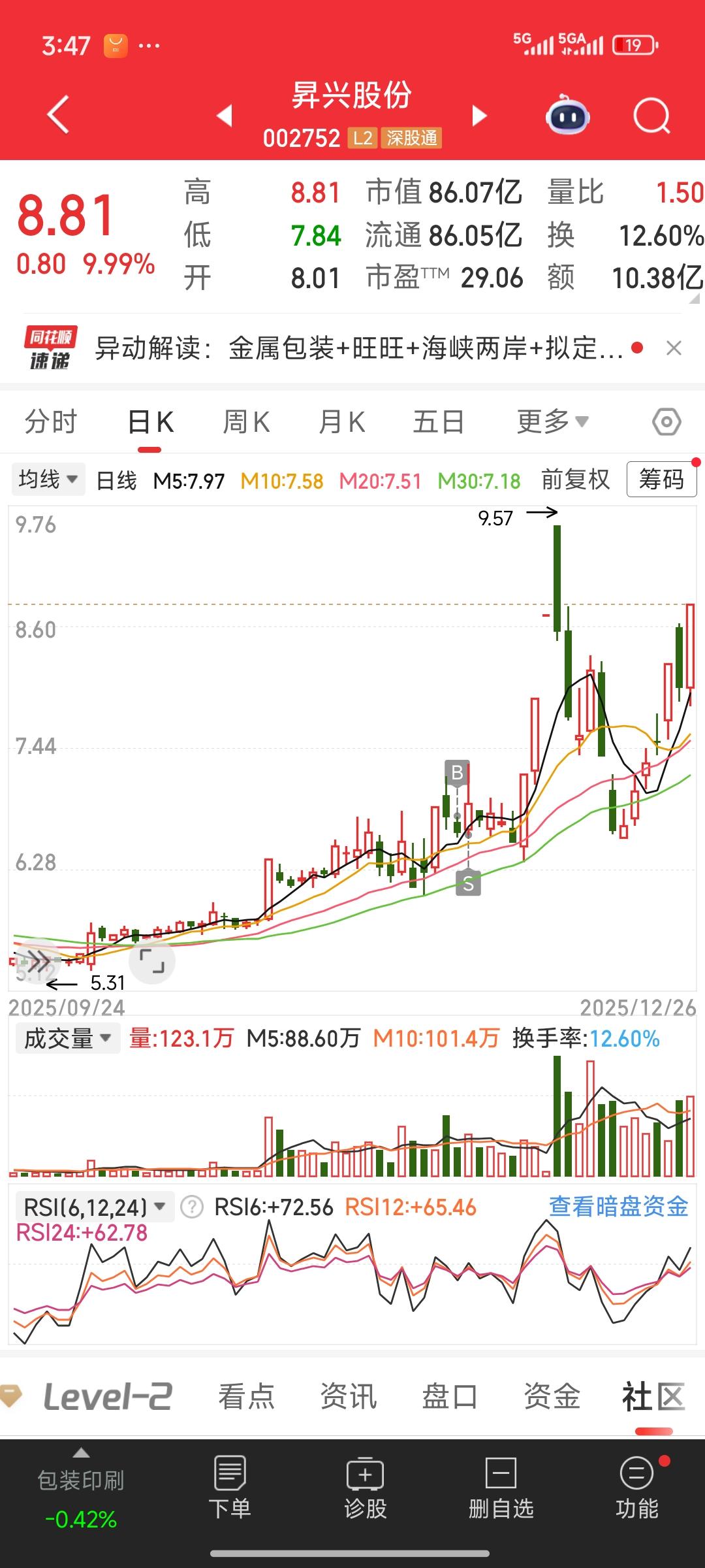 再次复盘包装三剑客,嘉美包装依旧牢牢封死一字涨停板,着实厉害。昨日一字涨停的合兴包装,今日却呈现巨量且大幅下挫的态势,还伴有巨量换手,分歧已然浮现。昇兴股份昨日调整,今日便强势涨停,一举跻身亚军之位。而嘉美包装始终稳坐领军之位。 那具有馆长概念的核心包装,在周末馆长直播带货的情形下,下周会不会反包涨停呢?虽有此期待,但我已不敢再博,胆小的我先行下车了。
