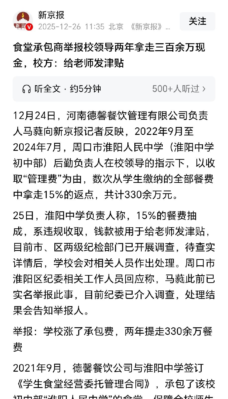 必须严惩!河南周口,某餐饮公司承包中学食堂,按照每人每天20元的标准,保障3000名师生的一日三餐。承包合同明确约定,学校按照营业额的4.5%收取管理费,可谁知,刚经营了一年,学校后勤部主任就擅自把管理费提高至营业额的15%,还要求餐饮公司老板取成现金交给他,短短两年时间内,拿走三百多万现金。老板不堪重负,举报学校,校方表示,这些钱都用来给老师发津贴了。网友担忧:最终还是家长承担了所有。 2024年12月,餐饮公司老板马女士憋着一肚子委屈,把合作学校的“操作”给曝光出来,两年时间里,学校硬是违规多收了她330多万的“管理费”。 每人每天20块的餐费,本来是给孩子吃饭的,却被学校克扣,这不禁令人担忧:孩子们能吃的好吗? 事情得从2021年说起,当时马女士的餐饮管理公司和周口市这所中学签了三年的合同,承包了初中部的食堂,要给全校3000来名师生保障早中晚三餐。 合同里写得明明白白,学校按营业额的4.5%收管理费,剩下的钱再转给餐饮公司。 头一年合作还挺顺利,马女士按规矩办事,校方也没出啥幺蛾子,扣除4.5%的管理费后,餐费都会按时到账,她心里还挺踏实,想着好好干满这三年。 万万没想到,好景不长。2022年9月开学没多久,马女士就接到了校领导的通知,说是管理费要从原来的4.5%涨到15%,足足翻了三倍多。 马女士还想交涉一下,但校领导直接来一句“不愿意交就走人”,没给她半点商量的余地。 马女士前期投了那么多钱装修食堂、添置设备,要是现在撤场,之前的投入全打了水漂;可要是答应这个离谱的要求,利润一下子被压缩得没多少,经营压力实在太大。 思来想去,马女士实在没辙,只能咬着牙答应下来,毕竟开弓没有回头箭,总不能让前期的心血白费。 从那以后,交钱的方式也变得奇怪起来。学校派驻初中部的后勤部主任石某,会先把核算好的全部餐费转给马女士,然后让她取出现金,再把其中15%的钱返还给他。 马女士后来翻出和石某的微信聊天记录,2023年5月,石某还把一张打印的餐费核算单拍给她,让马女士按要求取钱。 那张单子上写着,当年4月份七、八年级2300多名学生24天的餐费总共112万余元,石某用红笔圈出来的返还金额就足足有67万多。 不仅如此,两年时间里,马女士前前后后取了5次现金,加起来有330多万。 刚开始是直接把钱交给石某,后面更离谱,石某会带着另一个陌生男子,等马女士从银行取出现金后,没出柜台就直接把钱存进了那名男子的个人账户里。 每次取这么多现金,马女士心里都七上八下的,一方面觉得这种现金交易不合规,另一方面又怕得罪校方丢了生意,只能一次次妥协。 长期这么折腾,马女士实在扛不住了。 330多万可不是小数目,按20元一天的标准给3000名师生供三餐,利润本来就不算高,再被抽走15%,餐饮公司几乎没什么赚头,有时候甚至要贴钱运营。 忍了两年后,马女士再也忍不住了,直接把学校的违规行为给举报了。 12月25日,学校领导徐某回应,按照教育部的文件要求,学校已经取消了管理费,不再收取任何费用,所以这15%的抽成确实是违规的。 至于这笔钱的去向,徐某坦言是用来给老师发津贴了。 目前市、区两级纪检部门已经介入调查,学校也在积极配合。 对此,有网友认为:合同写得清清楚楚,说涨就涨,还要求现金交易,这明显就是违规操作。 更有不少家长担忧:孩子的餐费是我们一分一分交的,本来是保障孩子吃饭的钱,最后却变成了老师的津贴,说到底还是我们家长承担了所有损失。 《民法典》第五百七十七条规定:当事人一方不履行合同义务或者履行合同义务不符合约定的,应当承担继续履行、采取补救措施或者赔偿损失等违约责任。 餐饮公司与学校签订的《学生食堂经营委托管理合同》,对双方均具有法律约束力,其中明确约定学校按营业额4.5%收取管理费。 但是,校方未经协商单方将管理费提高至15%,并以“不愿意交就走人”的强硬态度施压,属于典型的不履行合同约定义务的行为。 后勤主任石某以现金返还的方式违规收取15%抽成,既违背合同约定的结算方式,又违反中小学校食堂“公益性、非营利性”的监管要求,构成双重违约。 因此,校方应当承担继续履行原合同约定、返还违规收取的330余万元款项,以及赔偿餐饮公司因利润压缩、垫资运营等产生的实际损失的违约责任。 此外,石某等人利用负责食堂承包管理、餐费核算结算的职务便利,以“管理费”为名,通过单方提高收费比例、要求现金返还、指定存入个人账户等隐蔽方式,非法占有该笔公共财物,且数额高达330余万元,已经涉嫌贪污犯罪。 即便校方声称涉案款项用于发放教师津贴,也不能改变其非法占有公共财物的本质,仅可作为量刑时的考量情节,不影响贪污罪的成立。