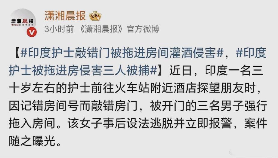 近日,印度发生一起令人发指的罪案。一名30岁的女护士前往火车站附近一家酒店,本想找住在105号房的朋友借钱,却不慎误敲了205号的房门。 房门打开后,屋内的三名男子竟将这名女护士强行拖入房间,并对她进行了长达4小时的残忍侵犯。事后,警方根据报案将三名嫌犯逮捕。 更令人震惊的是三人的身份。他们并非无业游民,其中两人是体面的银行职员,另一人还是某顶尖高校的硕士研究生。这种高学历背景与极端暴行的巨大反差,让当地民众感到无比愤怒与错愕。 这事最讽刺的地方,就是这三个人的身份。银行职员、名校硕士,听起来都是社会上的“体面人”,干出来的事却禽兽不如。这说明坏根和学历、职业没半点关系,人皮底下是人是鬼,真看不出来。 印度这种针对女性的暴力犯罪这么多,根子就在于犯罪成本太低,社会和法律对施暴者太宽容。这三位所谓的“精英”肯定是觉得能一手遮天,才这么无法无天。要是不用重典严惩,今天倒霉的是这个护士,明天就可能是在街上的任何一个女性。这根本不是社会地位问题,而是最基本的法治和人性出了大问题。