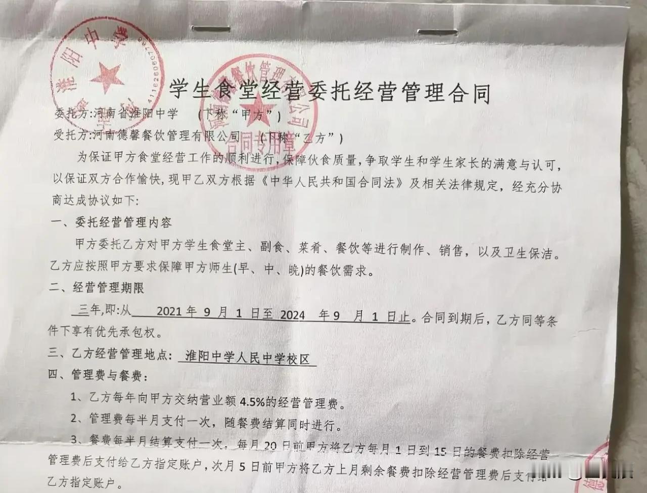 食堂承包商撕开黑幕,周口淮阳中学三年收走330多万元食堂管理费给老师发津贴! 真是不说不知道,一说吓一跳。注册地为周口市的河南德馨餐饮管理有限公司,2021年9月与淮阳中学签订合同,承包该校初中部“淮阳人民中学”的食堂,负责给全校师生供应三餐,承包期三年。 本来合同约定的承包管理费是营业额的4.5%,但2022年9月校方竟通知德馨公司管理费要涨到15%,而且校领导明确指示,不愿意交就走人! 德馨公司考虑到前期投入成本高,半途撤走损失太大,只好忍气吞声。之后几年承包期内,德馨公司账户陆续被淮阳中学派驻初中部的后勤主任石某拿走累计330多万元现金。 搞笑的是,就在德馨公司负责人马某向媒体曝光这起内幕时,现任淮阳中学DWSJ徐某口头承认这笔餐费抽成属于违规收取,但这些钱都用于发放老师津贴了。有网友调侃,把集体贪污说得这么冠冕堂皇,怕只有他了。