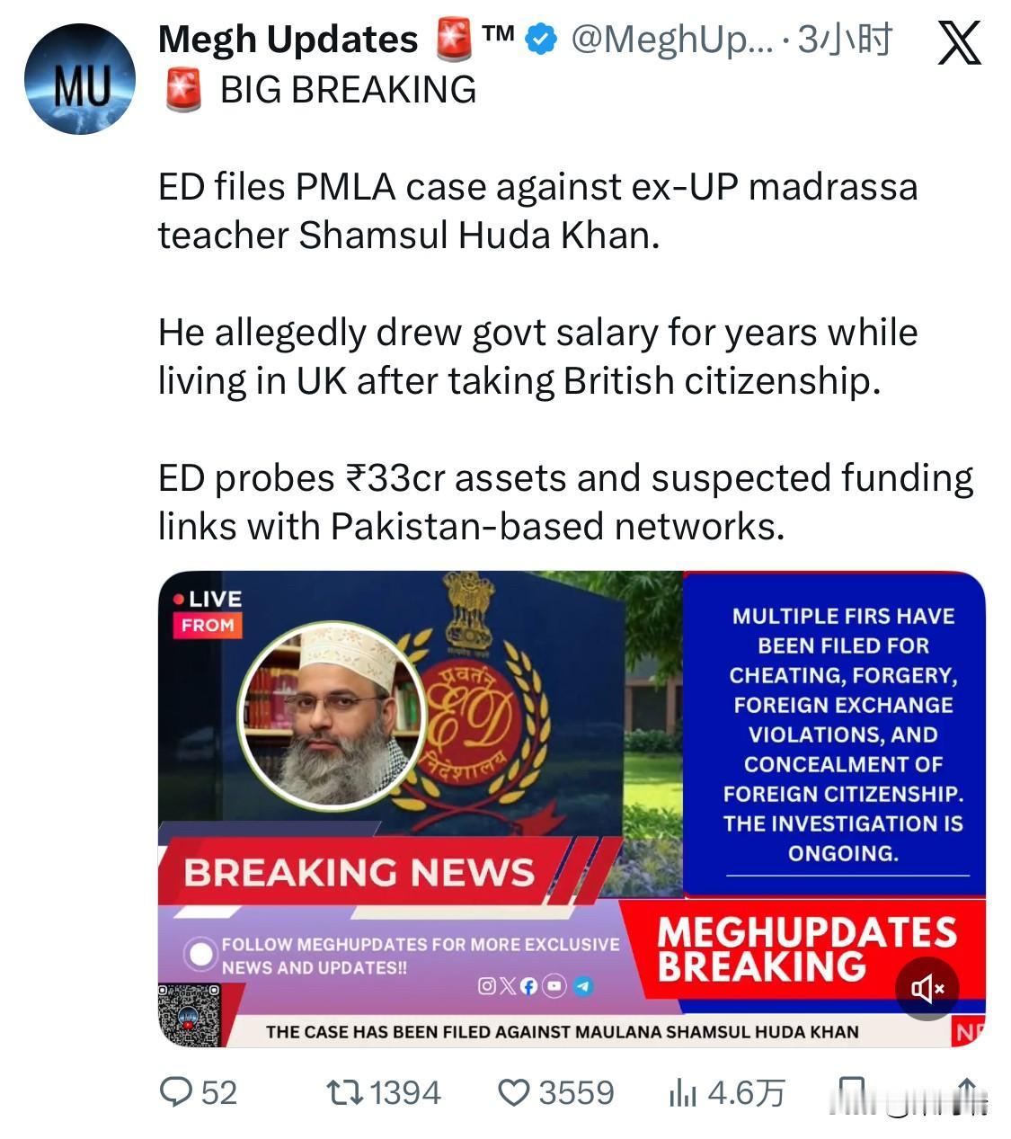 2025年12月,印度执法局(ED)正式根据《防止洗钱法》(PMLA)对前北方邦伊斯兰学校(Madrasa)教师、现旅居英国的伊斯兰传教士沙姆苏尔·胡达·汗(Shamsul Huda Khan)提起诉讼。 以下是该案件的相关情况: 1. 核心指控 骗取政府薪资与福利:沙姆苏尔原为北方邦阿扎姆加尔(Azamgarh)一所政府资助伊斯兰学校的助教(1984年入职)。调查发现,他自2007年起定居英国并于2013年取得英国国籍,但在2013年至2017年期间,他既非印度公民也未履行教学职务,却仍违规领取印度政府发放的薪资,并在2017年违规获得自愿退休金和福利。 非法境外资金与洗钱:调查指控他在过去20年间多次前往巴基斯坦等国,并通过在印度的7至8个银行账户收受了数千万卢比的巨额不明资金。 激进组织关联:执法部门怀疑他与总部位于巴基斯坦的激进组织 Dawat-e-Islami 及英国的其他激进组织有联系,并利用宗教教育为掩护,通过其设立的非政府组织“Raja Foundation”向多家伊斯兰学校输送资金,推行激进思想。 2. 涉案资产 巨额财产:执法局发现他在印度多地拥有超过12处不动产,估计价值超过 3亿卢比(约30 Crore),另有约5000万卢比的现金资产。 3. 案件进展 背景渊源:此案源于北方邦反恐小组(UP ATS)此前发起的调查和立案。 行政处分:他在阿扎姆加尔和圣卡比尔纳加尔(Sant Kabir Nagar)设立的两所伊斯兰学校因违反规定已被注销登记并查封。 当前状态:执法局目前正在追踪其资金链、海外联系及资产明细。由于沙姆苏尔目前身处英国,印度官方正就其非法资金往来和危害国家安全的嫌疑进行深入调查。
