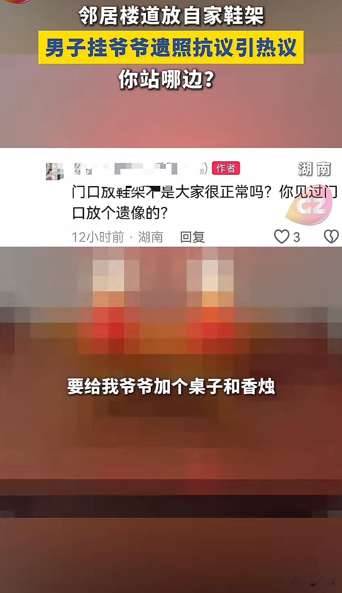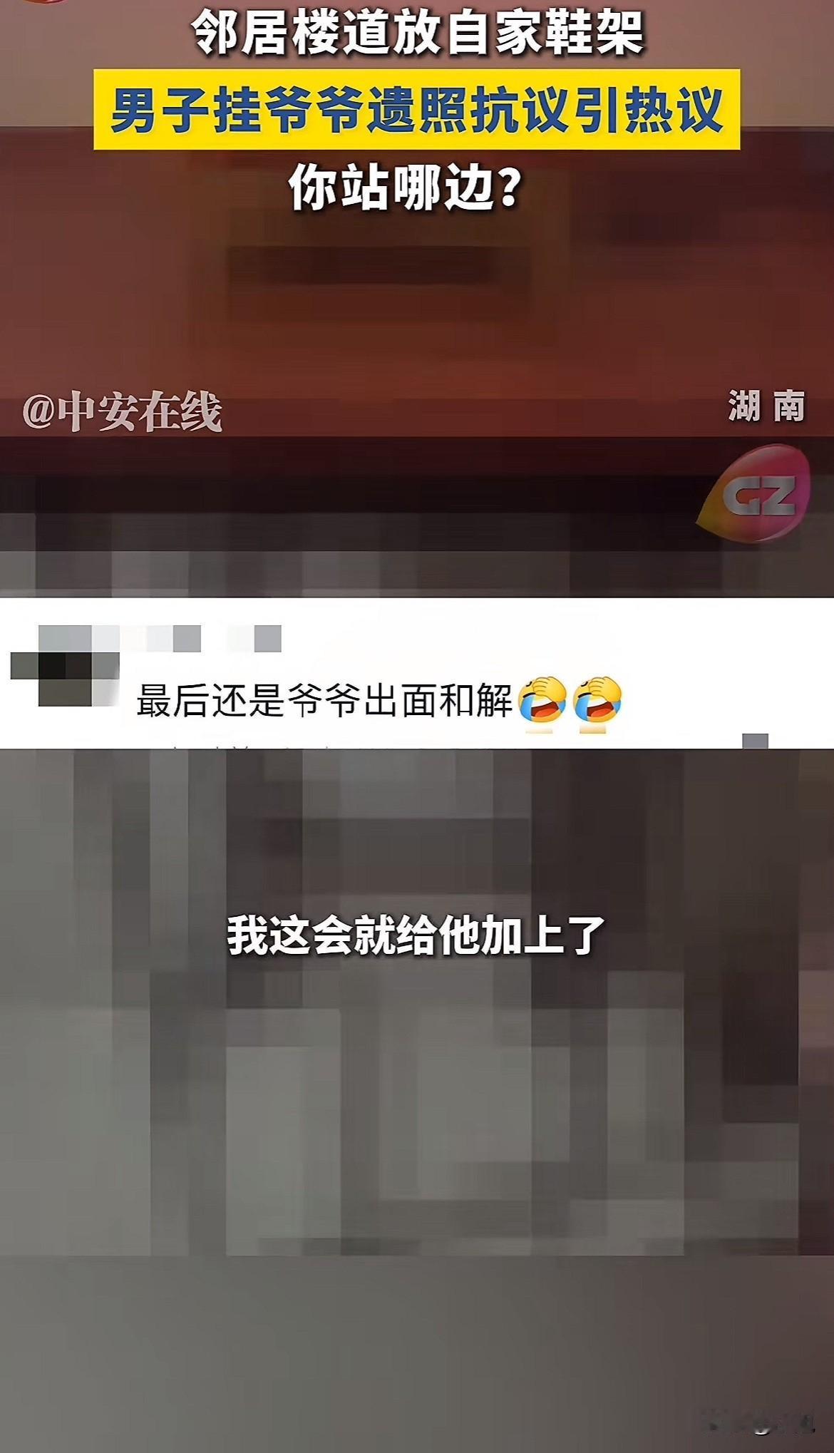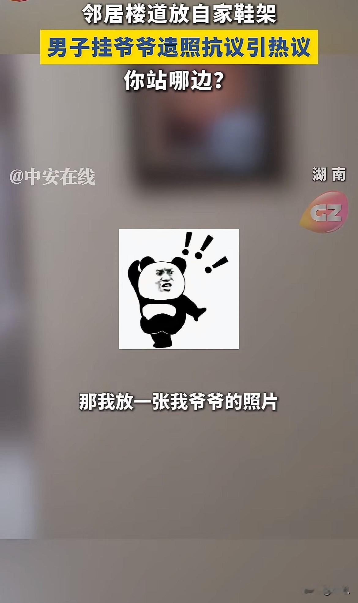 解气!湖南有个男子,为了对付邻居摆在楼道里的鞋架,竟然把自己爷爷的遗照给挂出来了