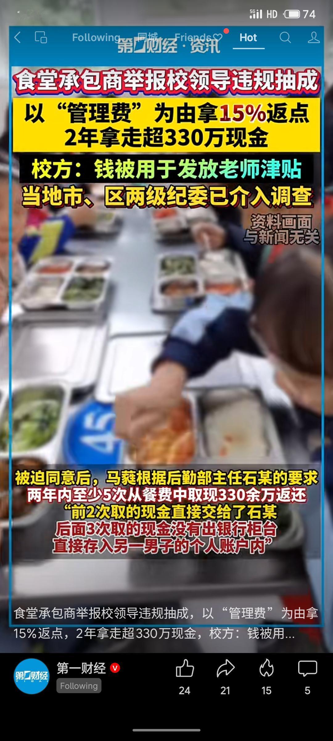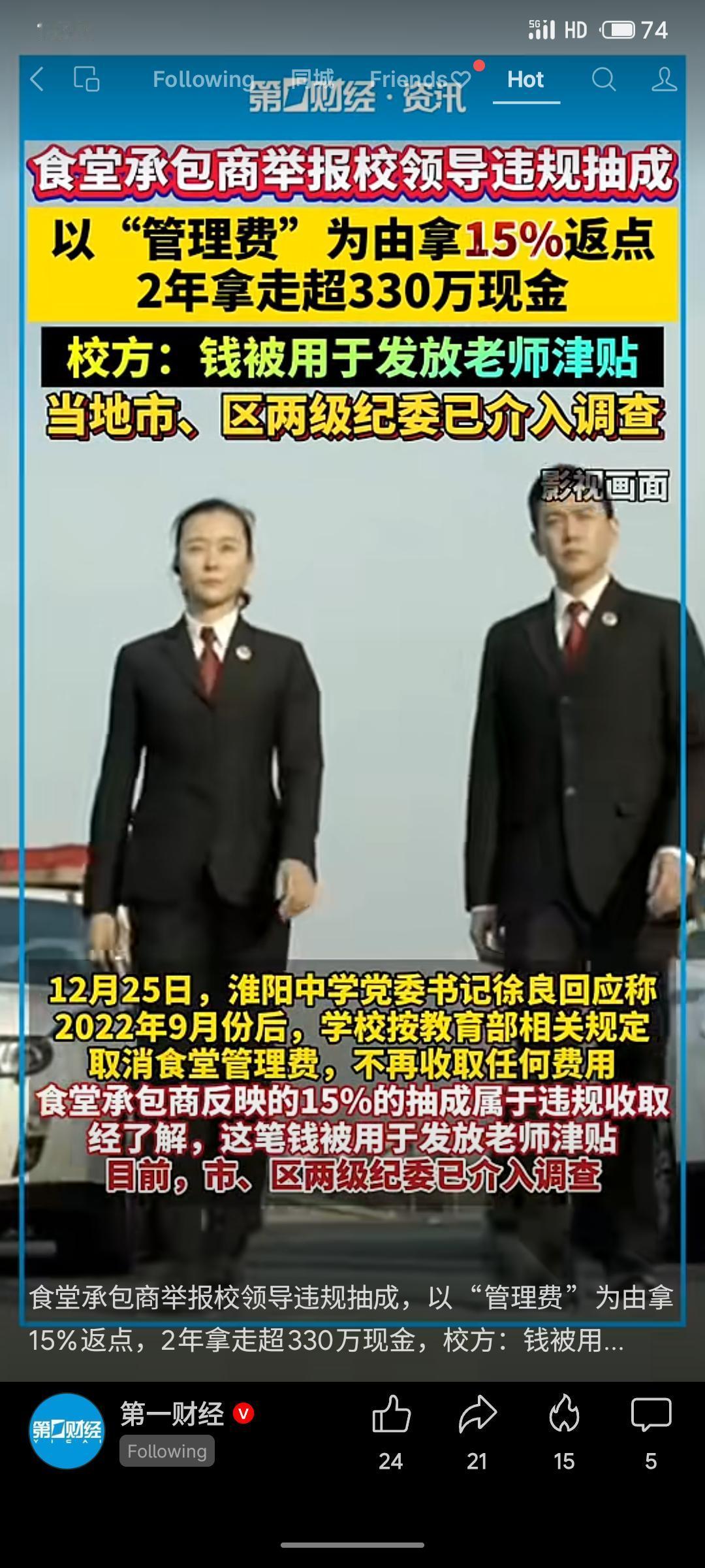 河南周口淮阳中学食堂承包商实名举报,校领导以“管理费”名义违规从学生餐费中抽取15%返点,两年内取现超330万元。校方称该款项用于发放教师津贴,但承认属于违规收费。目前当地市、区两级纪委已介入调查。