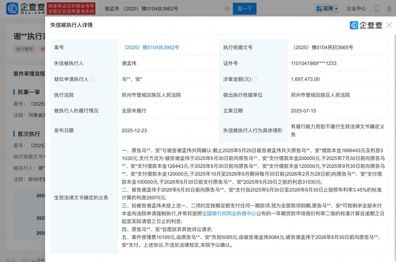 【嘎子哥谢孟伟成老赖】嘎子谢孟伟拒还169万欠款成老赖 企查查APP显示,近日,谢孟伟(嘎子哥)因“有履行能力而拒不履行生效法律文书确定义务”被法院列为失信被执行人(老赖),涉及169万元民间借贷纠纷案件。据文书内容显示,两原告与被告谢孟伟共同确认:谢孟伟共欠原告借款本金166万、利息3万余元,支付方式为:谢孟伟分批支付借款本金及利息。如谢孟伟未按约定按期足额支付任何一期款项,则原告可就剩余全部未付本金向法院申请强制执行。 此前,谢孟伟已因多起案件被执行超2000万,并多次被限制高消费。