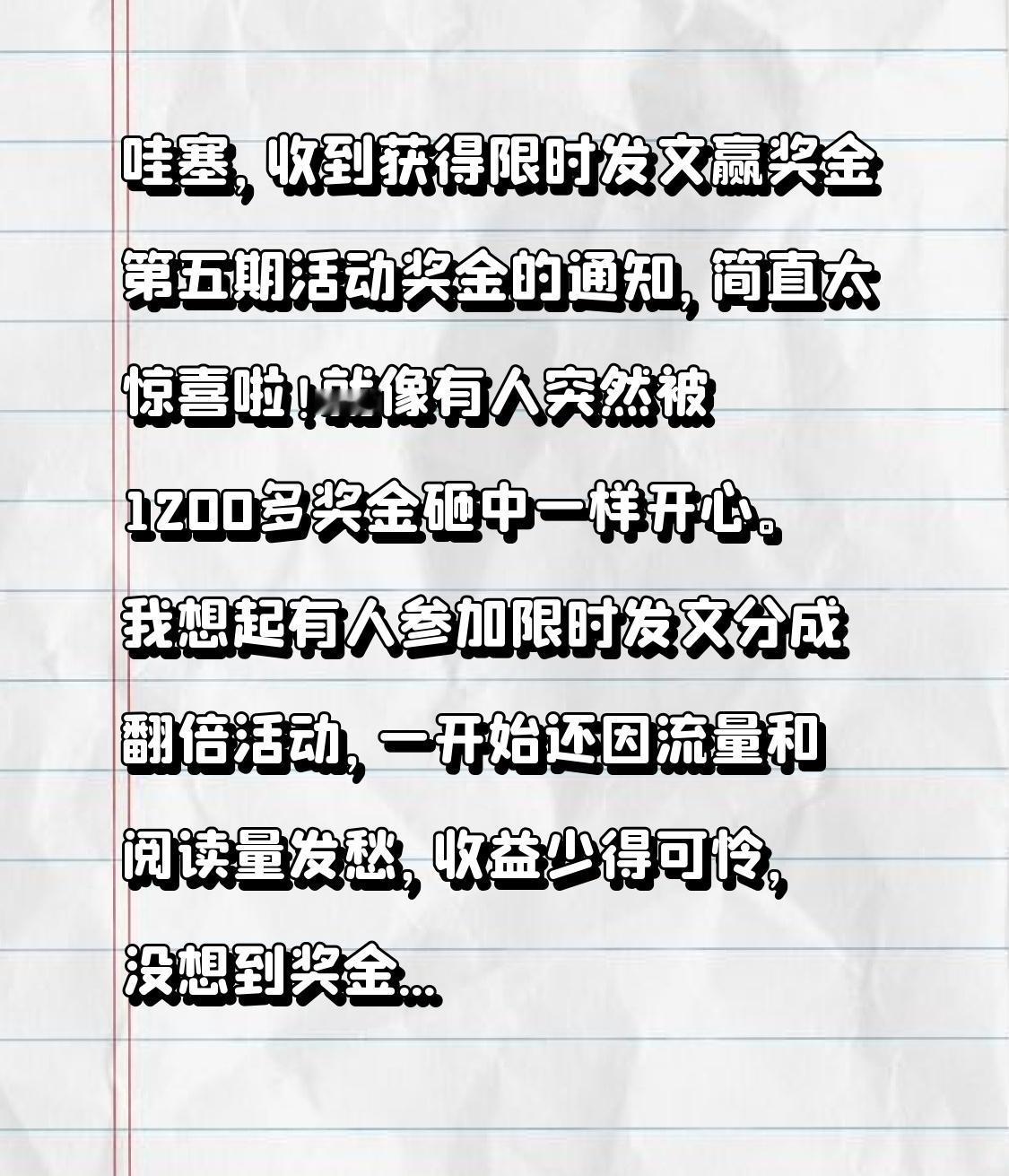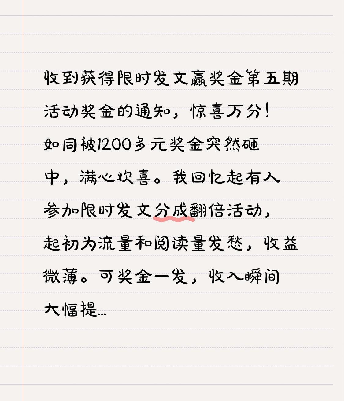 收到获得限时发文赢奖金第五期活动奖金的通知,惊喜万分!如同被1200多元奖金突然