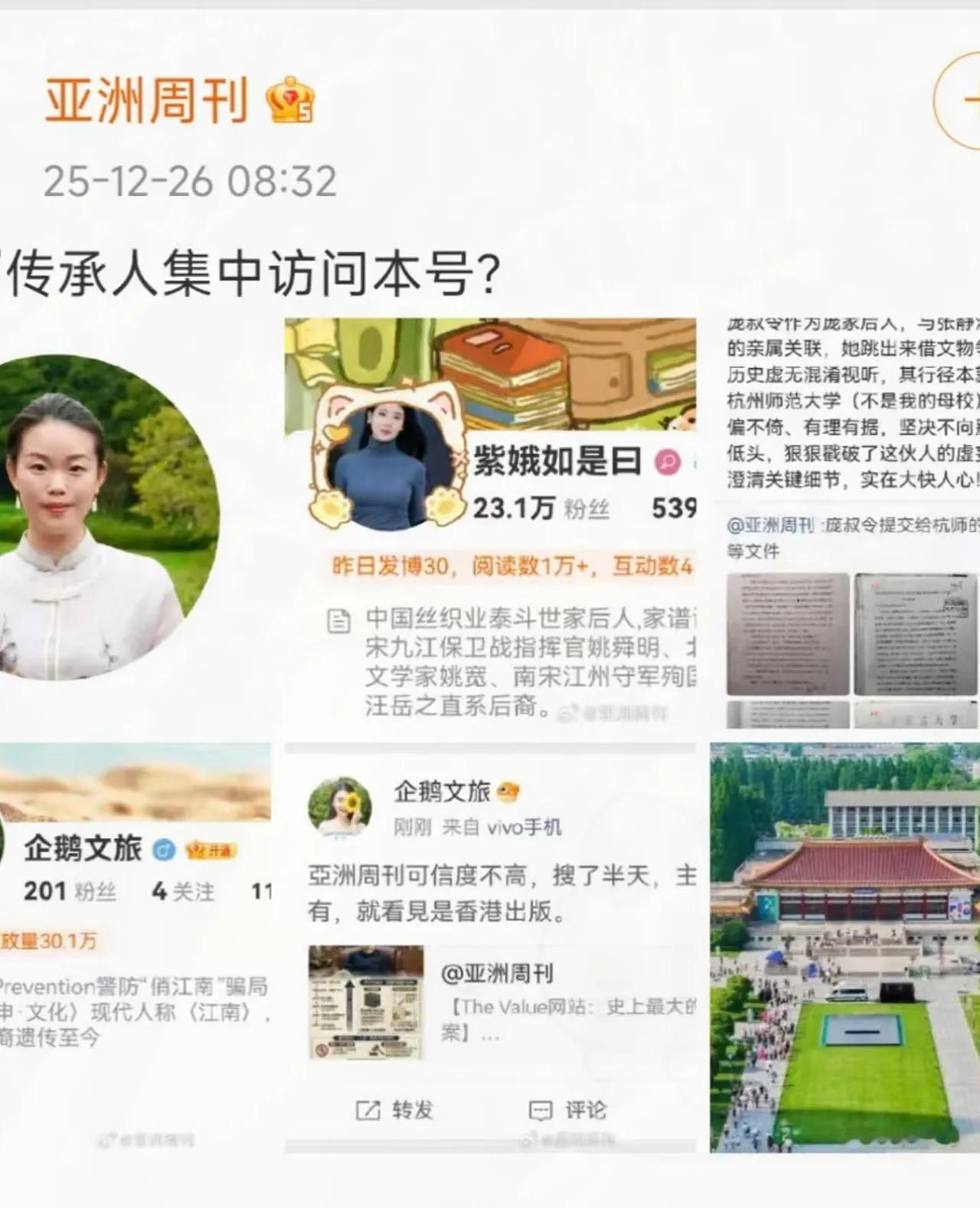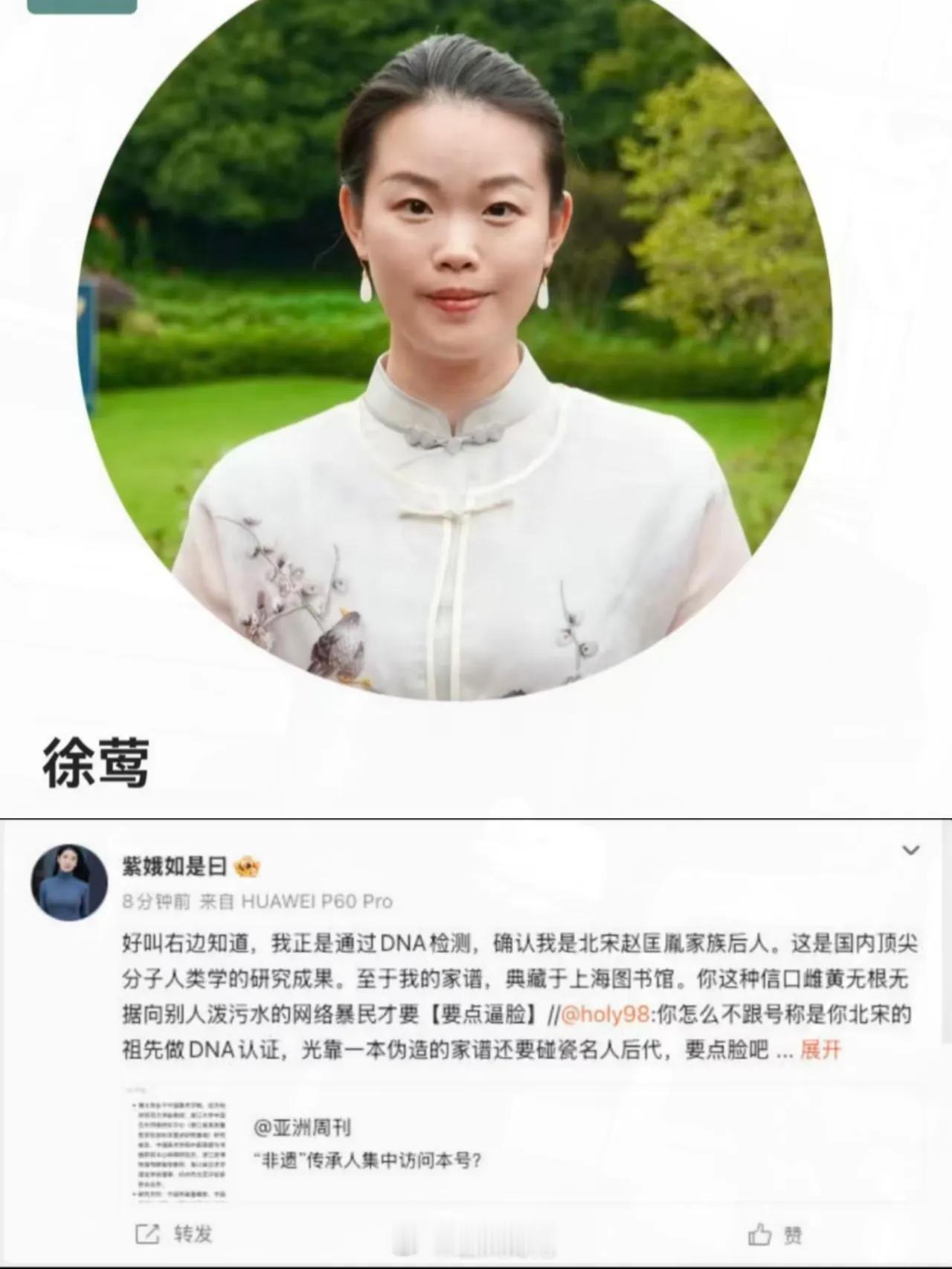 徐莺直接爆粗口, 竟然直接跟亚洲周刊硬刚, 亚洲周刊发一条,她就能直接 回怼好几条。 徐莺说亚洲周刊可信度不高,试图以个人之力否认庞叔令向亚洲周刊授权发布的材料信息。每当亚洲周刊发布关于南博事件的内容总是能够在评论区看到她的回应,这是和亚洲周刊杠上了。 之前用“庞家后人”身份行走收藏界遇到真正的庞家后人庞叔令,虚构的身份被对方戳破之后她并没有感到抱歉,反而有些恼羞成怒的感觉。如今她说庞叔令和张静江有扯不清的亲属关系,这一次是借文物争议出来兴风作浪。 可人家庞叔令明明只是想搞清楚太公庞虚斋捐赠的画作到底去了哪里,再有一个就是为庞家收藏名声正名,不认可赝品的说法。何况庞家是名门之后,如今更是无偿捐赠祖宅给国家,还将自家其他收藏展览出去供大众免费参观。 而徐莺现在还有了一个新的身份,她说自己是北宋赵匡胤家族后人,是经过DNA检测过真实性的,这就令人感到匪夷所思,先是“庞家后人”,现在又是“赵匡胤后人”,到底说话有没有可信度?