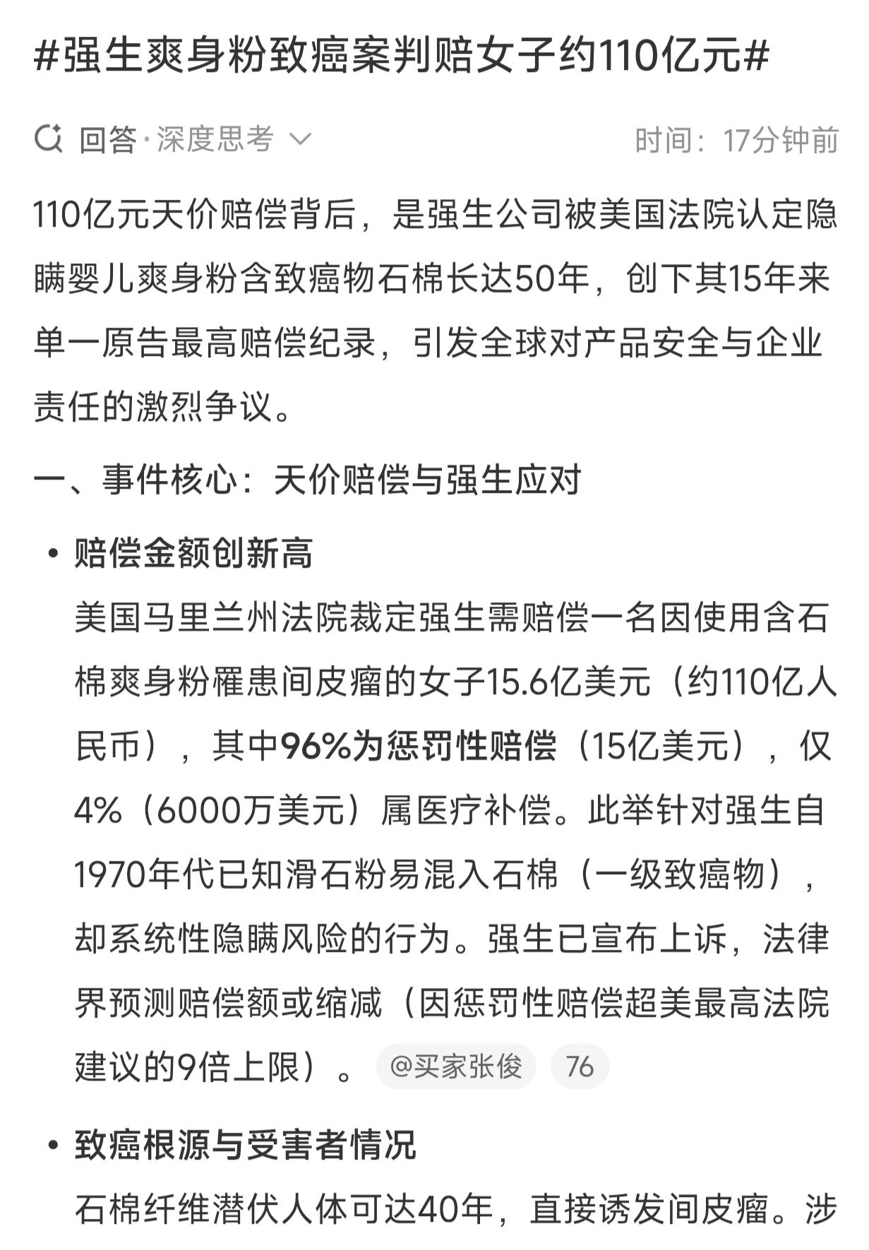 强生爽身粉致癌案判赔约110亿!何时国内食品安全企业也能这样重罚重判就好了!