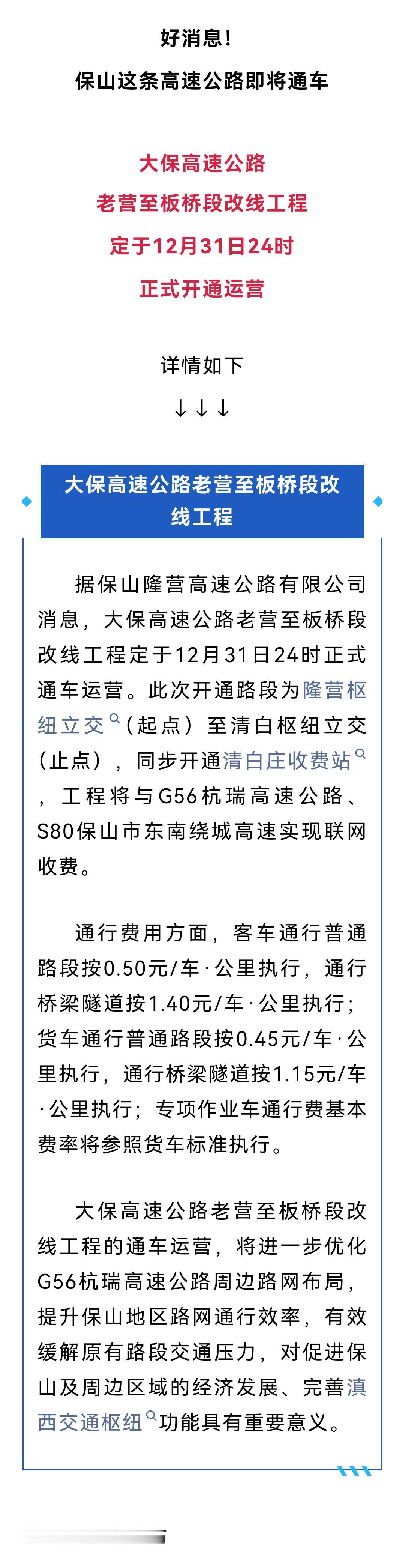 大保高速老营至板桥段改线工程12月31日正式通车。 大保高速公路这段改线工程12月31日通车收费。好消息,保山这条高速公路即将通车。大保高速公路老营至板桥段改线工程定于12月31日24时正式开通运营,详情如下。 大保高速公路老营至板桥段改线工程据保山隆营高速公路有限公司消息,大保高速公路老营至板桥段改线工程定于12月31日24时正式通车运营。此次开通路段为隆营枢纽立交至清白枢纽立交,同步开通清白庄收费站。工程将与G56杭瑞高速公路S80保山市东南绕城高速实现联网收费。 通行费用方面:客车通行普通路段按0.50元/车公里执行,通行桥梁隧道按1.40元/车公里执行,货车通行普通路段按0.45元/车公里执行,通行桥梁隧道按1.15元/车公里执行。专项作业车通行费基本费率将参照货车标准执行。 大保高速公路老营至板桥段改线工程的通车运营将进一步优化G56杭瑞高速公路周边路网布局,提升保山地区路网通行效率,有效缓解原有路段交通压力,对促进保山及周边区域的经济发展,完善滇西交通枢纽功能具有重要意义。