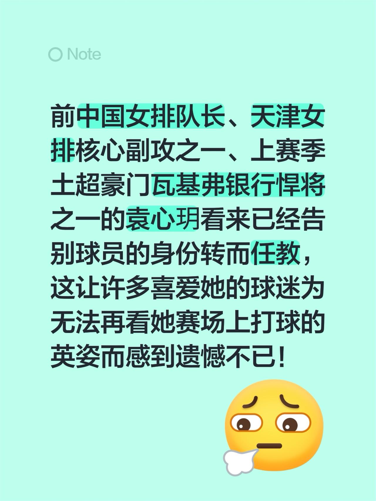 前中国女排队长、天津女排核心副攻之一、上赛季土超豪门瓦基弗银行悍将之一的袁心玥看来已经告别球员的身份转而任教,这让许多喜爱她的球迷为无法再看她赛场上打球的英姿而感到遗憾不已!