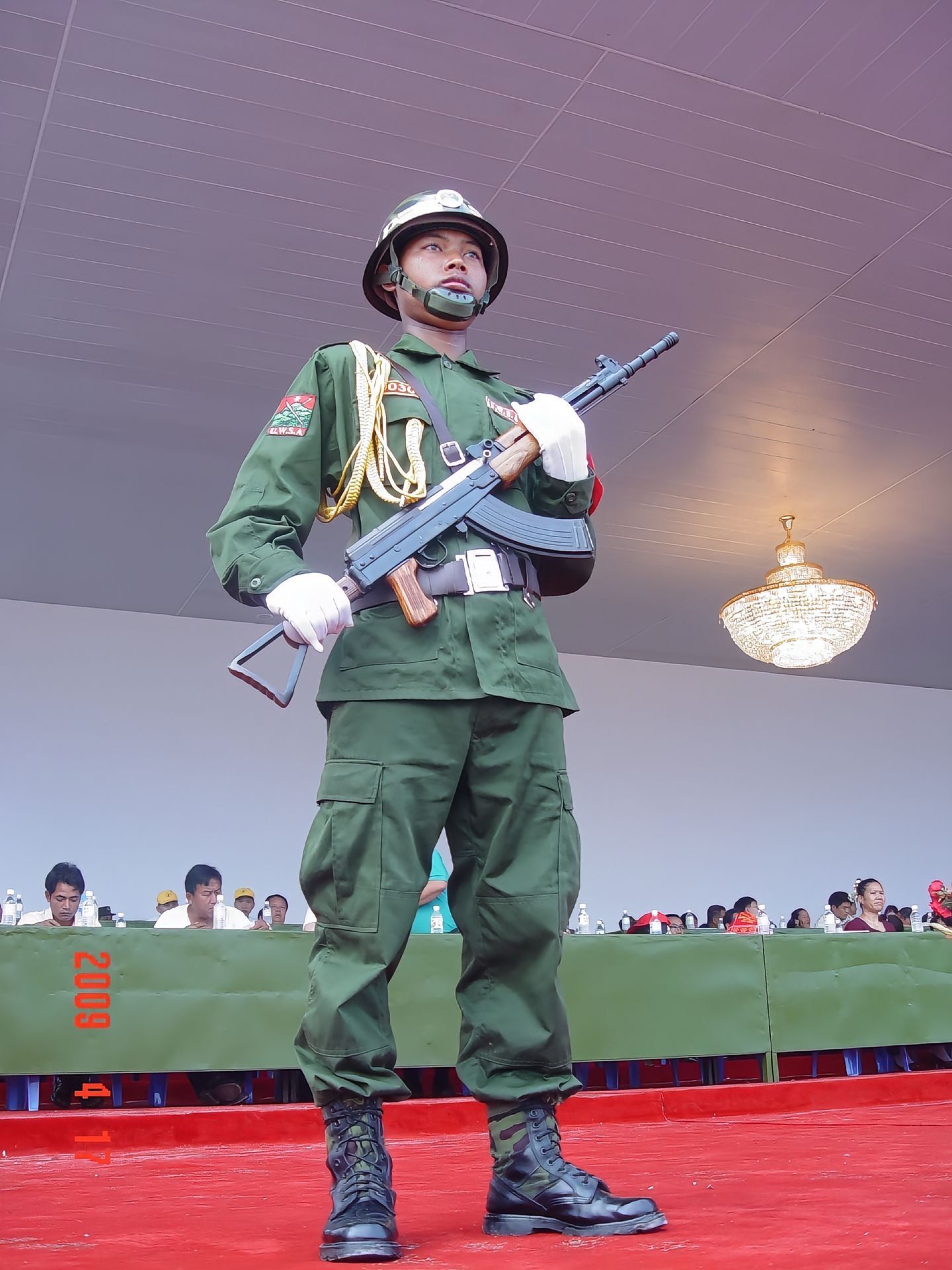2009年4月17日,🇲🇲掸邦第二特区(佤邦)和平建设20周年大庆/阅兵式上的卫兵,手里的就是佤联军初期仿制的81-1步枪/佤1型,准星座/护圈样式像反过来装的81轻机枪准星组件,这也是外观上最容易区分的部位。