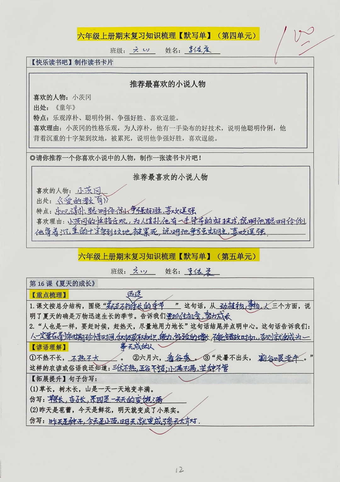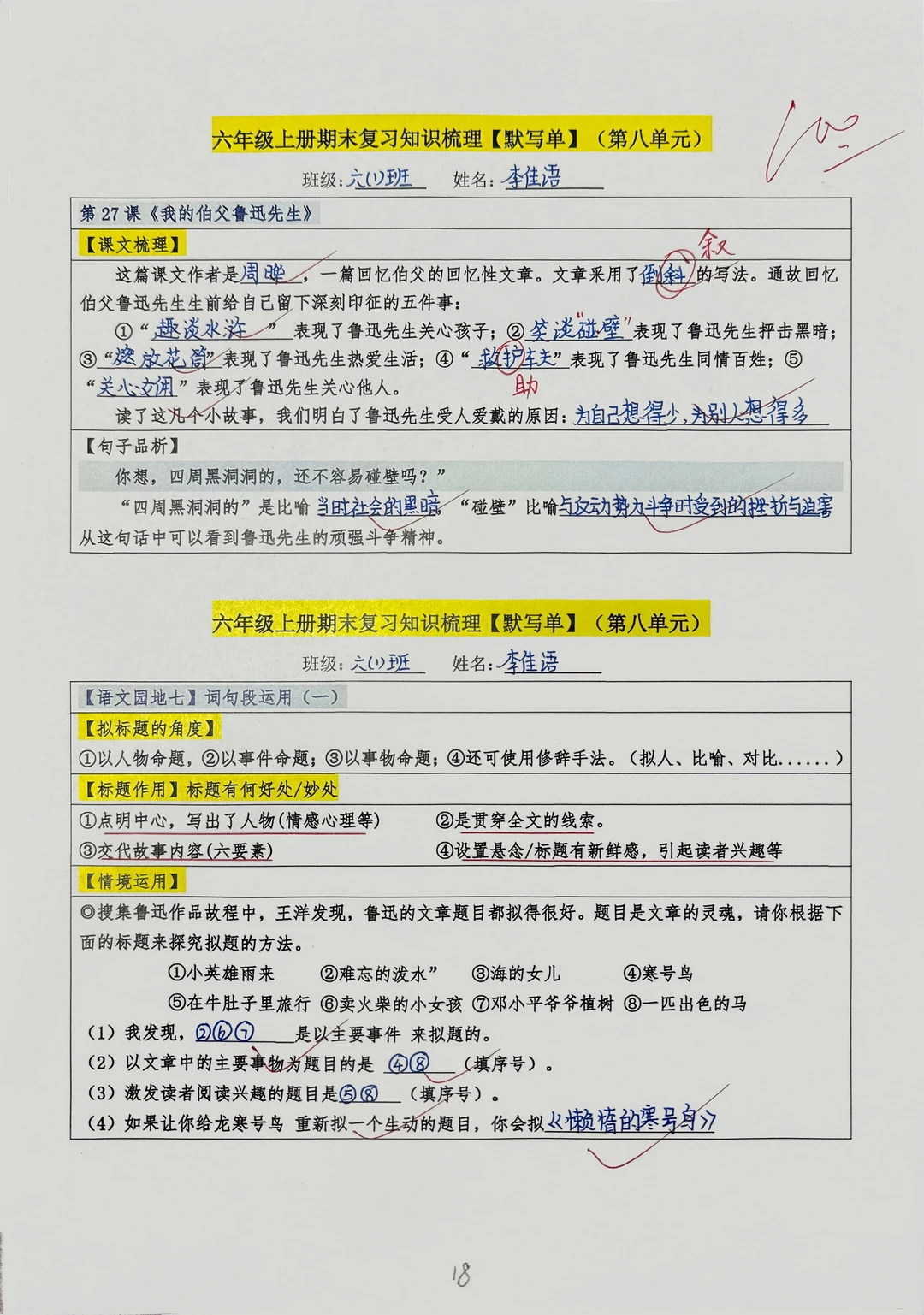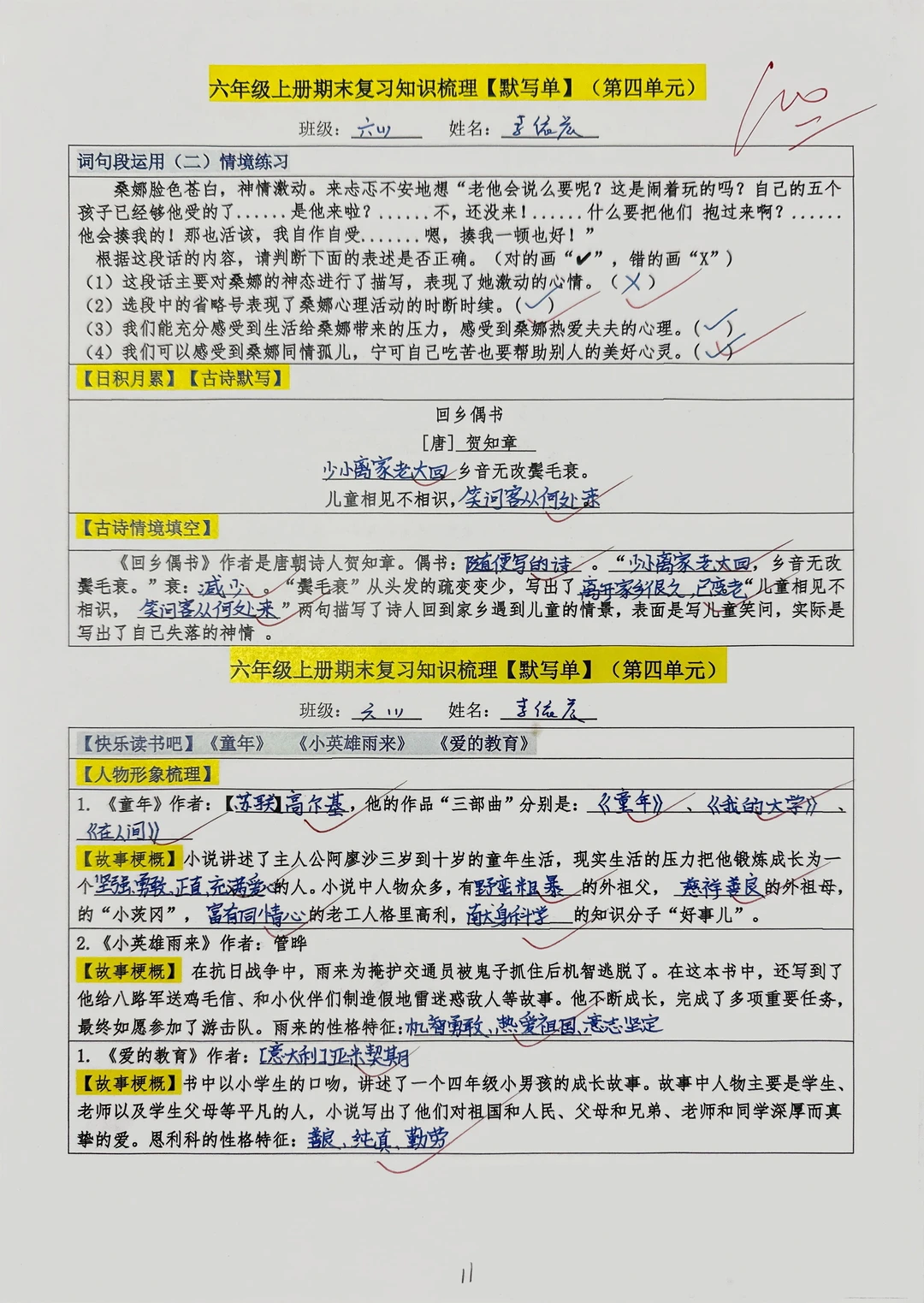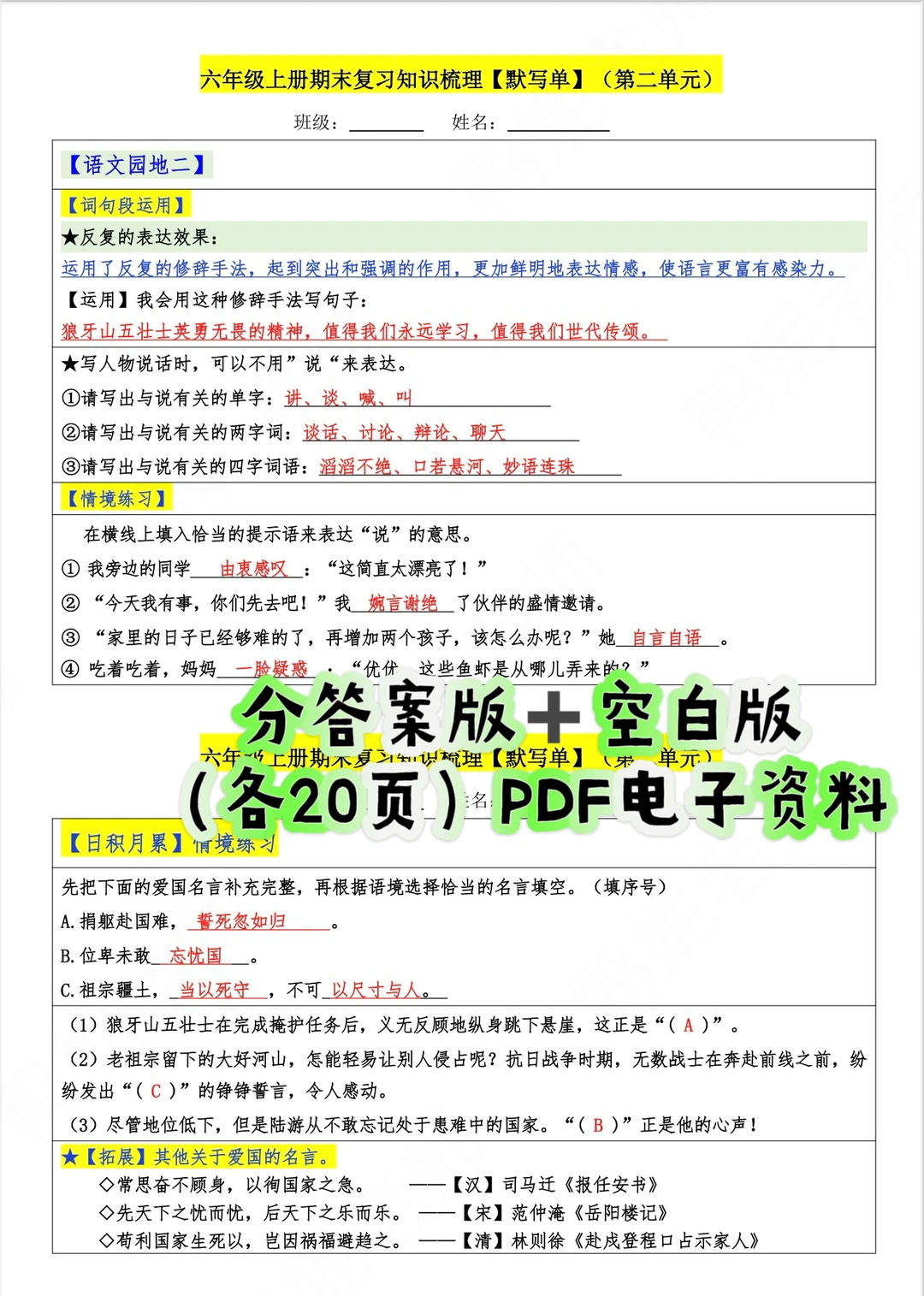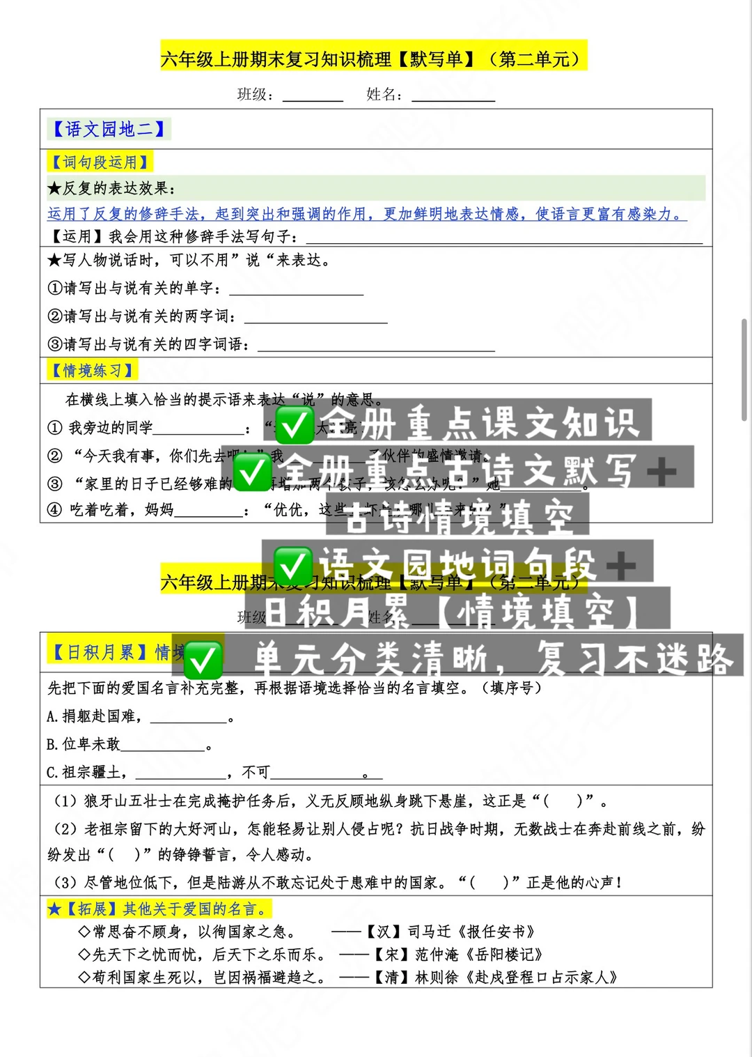 考前冲刺,书本基础知识给娃过一遍💯 👉鸭妮老师精心梳理的六上语文【1~8单元】必备内容默写单 ✅全册重点课文知识 ✅全册重点古诗文默写➕古诗情境填空 ✅语文园地词句段➕日积月累【情境填空】 ✅ 单元分类清晰,复习不迷路 【涵盖八个单元内容,分空白版(20页)➕答案版(20页)】