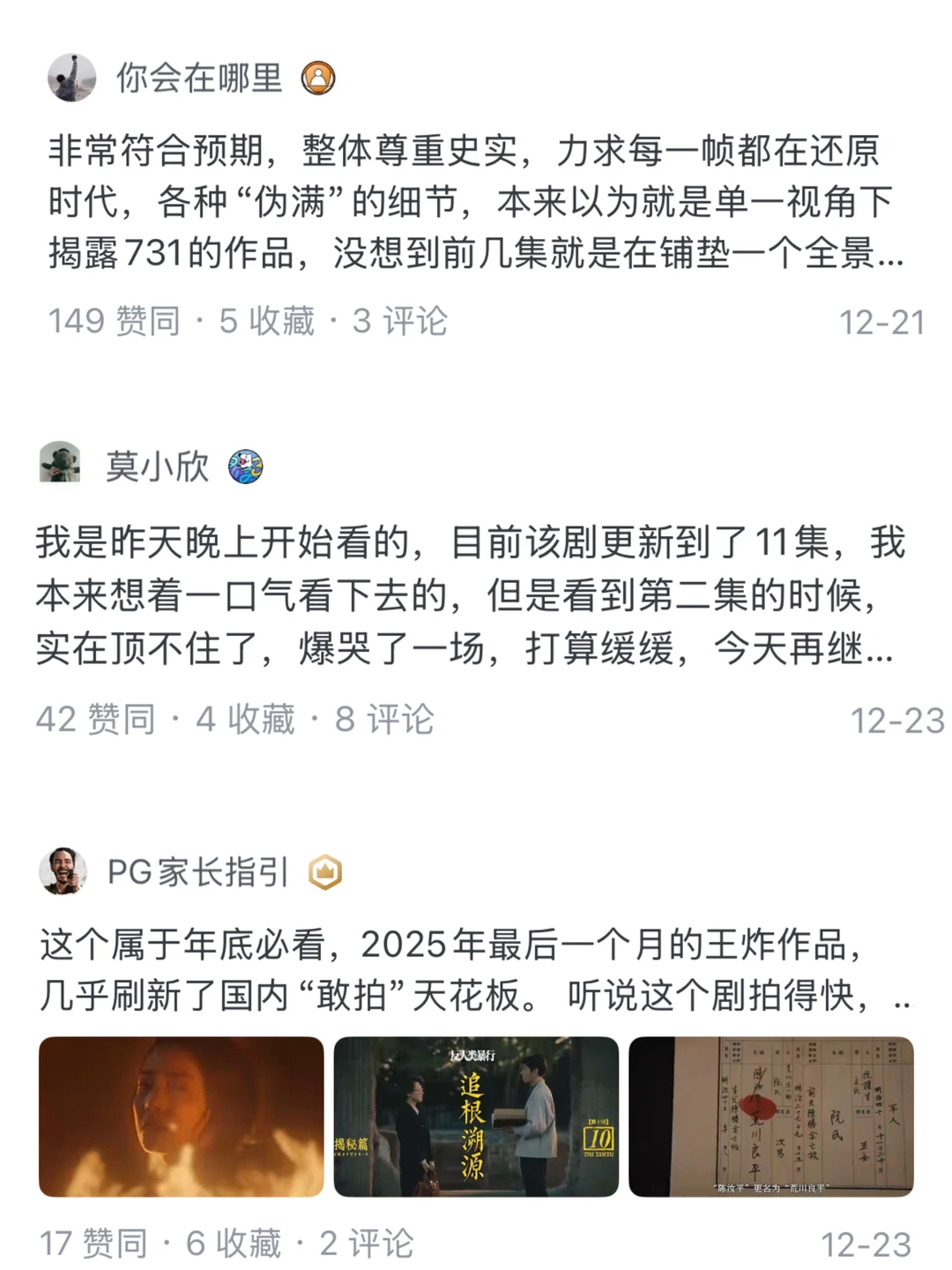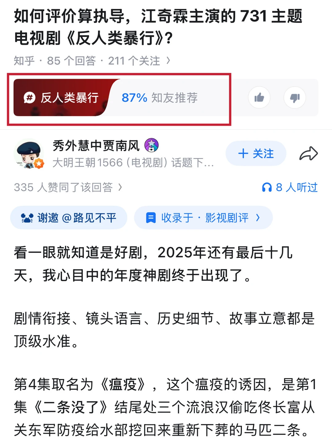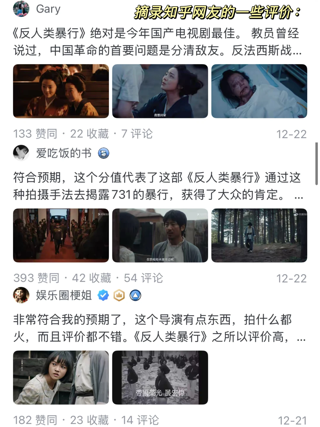 “如果受害者都忘了,那加害者怎么会记得?” 连刷十几集《反人类暴行》,全程攥紧拳头,边看边哭😭这部聚焦731部队侵华罪行的国产剧真的是堪称我心中的今年最佳!从不输电影般的质感,到对731监狱、实验室的1:1还原的认真,再到每一集环环相扣的剧情,想说这样的好剧没被更多国人看到真的是太可惜…… 你有过那种追剧时隔着屏幕都能感受到的简洁直白的震撼感吗?追《反人类暴行》时,我就是这样一种感受。 当送货郎佟长富为找马误入狼窝,亲眼见同胞被一批批当成编号“马路大”(原木)做各种实验;当那么多无辜的小孩子被解剖器官做成标本;当看到那些感染鼠疫的人们从一个个鲜活的样子被折磨的不成人样…没有夸张煽情,满屏都是那种细思极恐的压抑💔 最戳人的还有那些“无声的细节”: ✅实验室里只有脚步声和器械碰撞声的两分钟静默,比嘶吼更窒息; ✅每集片尾没有片尾曲,只有《伯力审判》的战犯原声录音,战犯沙哑的供述透过屏幕传来,字字千钧,比任何画面都震得人头皮发麻; ✅日军说“普通人火化要2小时,大块头3小时”,这句看似平淡的台词,背后是无数无辜生命被残害的铁证; 知乎上有段万赞回答这样说 “2025国剧天花板,它让历史剧不止于‘看故事’,更成了公共记忆的载体,看完真的会更清醒:警惕任何‘合理化暴行’的口号。” 没有狗血煽情,没有开挂主角,就凭着“还原真相”四个字,把731部队那段暗无天日的历史扒开在眼前。不看是遗憾,看过是震撼,更是铭记! 刷完剧去翻知乎年度剧集榜单,才发现它已经稳稳拿下知乎年度剧集榜单TOP1,知友推荐度87%我都觉得低了!没有流量的加持,没有过多的宣传,愣是靠着口碑一路高歌猛进,这样的国产剧活该爆火🔥 除了这部剧,在「知乎高分剧集榜单」中这次也是发现了不少好剧,比如韩剧《苦尽柑来遇见你》、美剧《百年孤独》、年代剧《北上》等,剧荒的宝子们赶紧马住看起来!没有什么事是比冬天宅在家追剧更幸福的事情了☕️ 电视剧反人类暴行  反人类暴行  2025高分影视推荐  2025知乎年度高分榜  高分国产剧  剧荒推荐  731部队  731部队罪恶  追剧人  追剧推荐