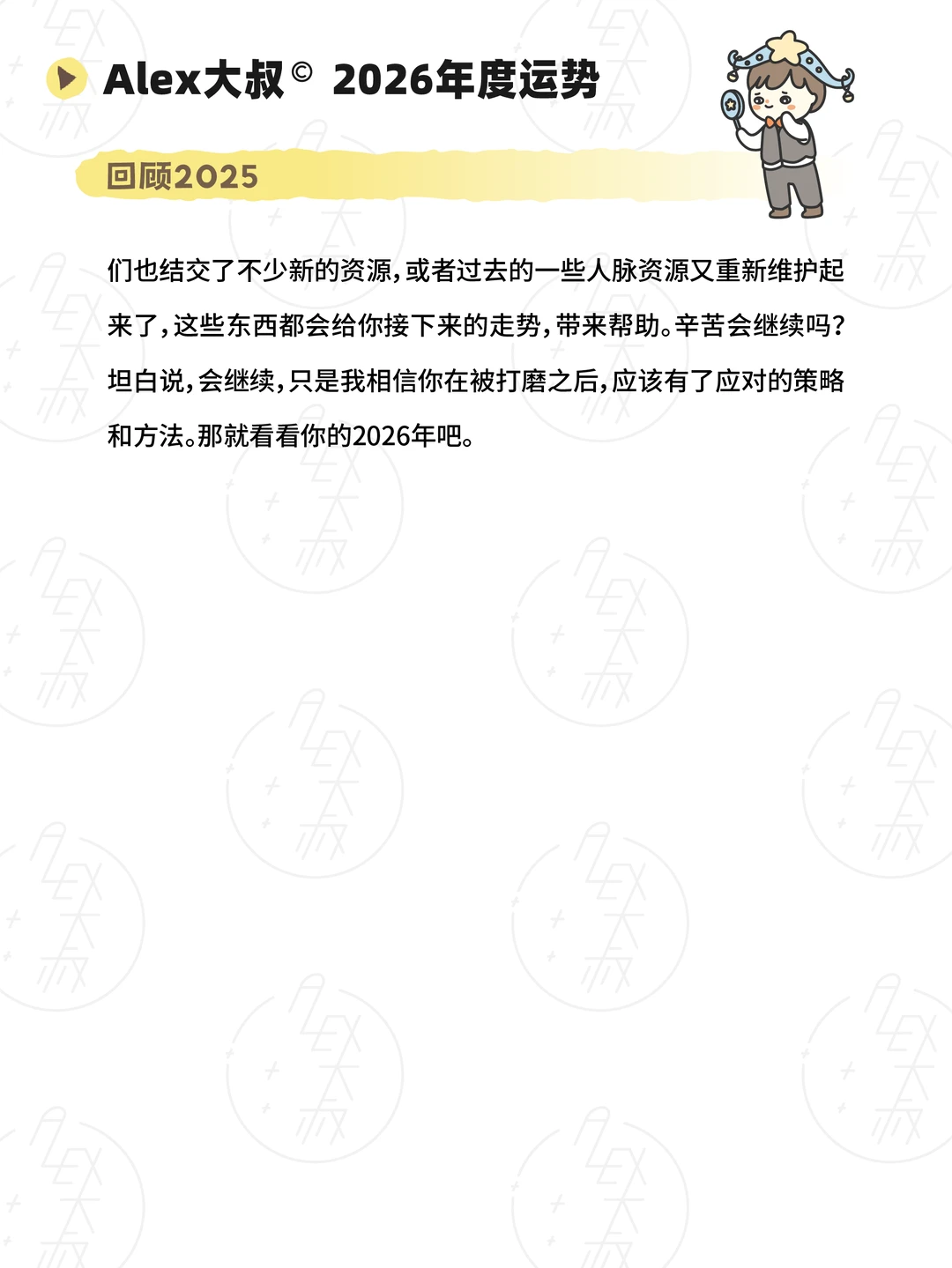 Ps: 大众运势无法对应到每个人,这是它的局限。我无法成为所谓的“指路明灯”。但如果年运的这些只言片语,能在某些时刻让你感受到共鸣、获得启发,并更好地生活在当下与未来,那么它的意义,已经足够。