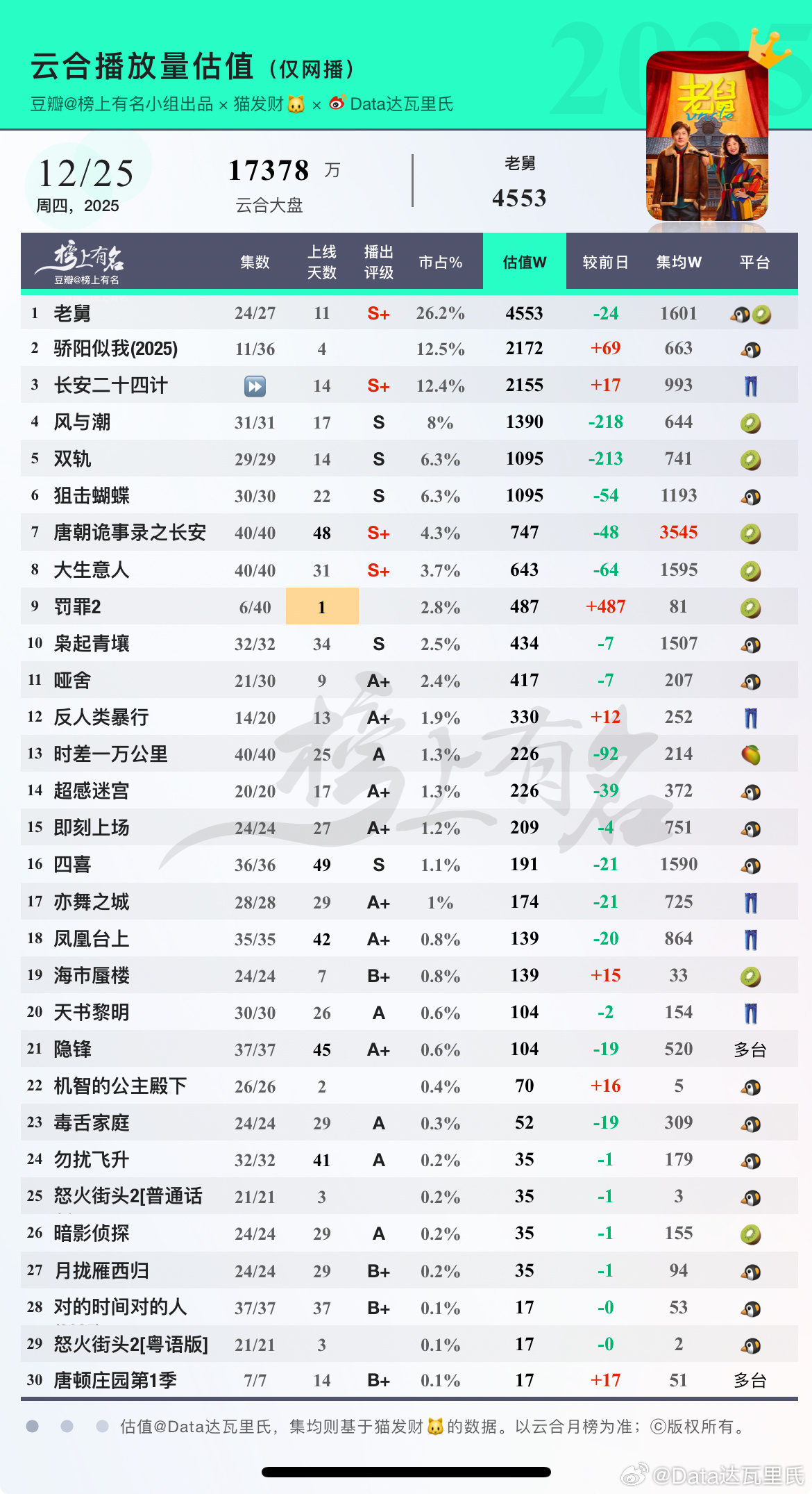 12.25云合估值🌴豆瓣榜上有名小组出品1 老舅 占比26.2% 4553 -242 骄阳似我(2025) 2172 +693 长安二十四计 ⏩ 超点完结 2155 +17 集均993万4 风与潮 1390 -2185 双轨 1095 -2136 狙击蝴蝶 1095 -547 唐朝诡事录之长安 747 -488 大生意人 643 -649 罚罪2 首播487 10 枭起青壤 434 -711 哑舍 417 -712 反人类暴行 330 +1213 时差一万公里 14 超感迷宫 15 即刻上场 16 四喜 17 亦舞之城 18 凤凰台上 19 海市蜃楼 20 天书黎明 罚罪2破7000罚罪2破7000