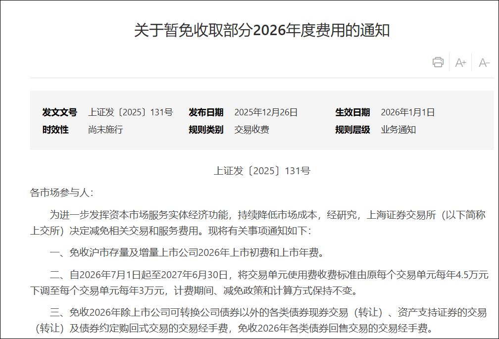 12月26日,中国资本市场迎来政策利好,沪深交易所同步发布通知,宣布推出2026年度系列降费措施。
