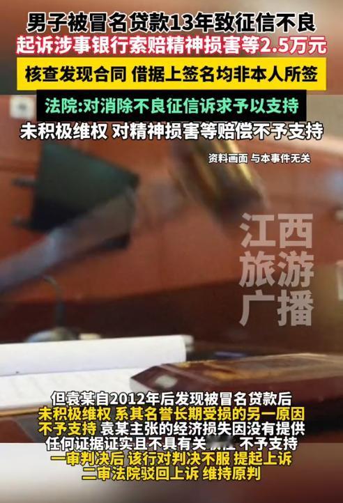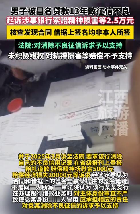 湖南,一男子准备贷款买车时发现贷款审核无法通过,查询后才得知自己在26年前有一笔1.9万元的逾期贷款。然而令人不理解的是,男子在得知有人冒用他的名字贷款后,并未立即维权,一直拖到13年后才起诉银行,并要求银行消除莫须有的贷款记录、登报道歉、赔偿2.5万元损失。(来源:江西旅游广播) 据悉,在2012年的时候,袁先生和妻子准备去4S店买辆车,当时销售推荐贷款买车优惠力度更大,于是袁先生选择了贷款。 然而在办理贷款业务时,工作人员发现袁先生的征信有问题,贷不了款。 袁先生当时还没意识到事情的严重性,当他前往人民银行查看征信后,这才得知在1999年12月19日,自己在张家界的某银行办理了一笔1.9万元的贷款,期限为2年,状态显示“逾期未还”,可袁先生表示自己从未去过张家界。 袁先生猜测大概率是有人冒名贷款,可他并未继续处理,即便后来申请信用卡被秒拒,妻子想做点小生意申请贷款也没能成功,袁先生也没有及时处理,一直拖了13年。 直到2025年3月份,实在没办法的袁先生一纸诉状将银行告上法院,要求银行消除不良记录、登报道歉,并赔偿精神抚慰金5000元、经济损失2万元。 可银行坚称当年办理贷款的手续是合规的,是袁先生自己贷了款又忘了还。 袁先生气坏了当庭申请了笔迹鉴定,最终的结果让银行一下就闭嘴了。 根据鉴定结果显示,银行提交的《保证担保借款合同》上的签名,并非袁先生所签,二者字迹完全不 同,这说明这笔1.9万元的贷款的确是有人冒名贷款的。 《民法典》第1012条规定,自然人享有姓名权,有权依法决定、使用、变更或者许可他人使用自己的姓名,但不得违背公序良俗。第1014条规定,任何组织或个人不得以干涉、盗用、假冒等方式侵害他人姓名权。 因此,那位假冒袁先生名字办理贷款的人员的行为已经违法。 袁先生认为,银行在放贷时有义务审核借款人的真实身份,如核对身份证、面签等。 可现在看来,银行在审核方面大概就是走了个过场,完全没有核对身份就放了款,这才导致袁先生背了锅。 法院经审理后认为,银行审查贷款人信息不严,导致袁先生的身份被人冒用,产生了不良记录,故应当由银行承担责任。 法院认为,银行应当积极配合袁先生将不良记录消除。 至于袁先生主张的精神损失费以及经济损失,法院认为个人征信记录的查询方式较为严格,除了本人和司法机构等,普通人无法查询。 因此,银行虽然存在审查不严的过错,但对袁先生的名誉没有造成任何损害。 此外,袁先生早就知道自己被冒名贷款一事,却并未及时维权,一直拖了13年,袁先生自身也有过错,所以银行无需登报赔礼道歉。 《关于确定民事侵权精神损害赔偿责任若干问题的解释》第8条规定,因侵权致人精神损害,但未造成严重后果,受害人请求赔偿精神损害的,一般不予支持。 法院认为,袁先生无法证明其因征信问题,导致社会评价降低,以及受到严重精神损害,故对其主张的精神损害赔偿不予支持。 最后,法院判决银行应当在15天内负责消除袁先生的不良征信记录,同时驳回了袁先生的其他诉请。 袁先生对这一判决比较满意,没打算继续上诉,可银行却提起了上诉,要求改判。 二审法院认为,一审法院认定事实清楚,根据鉴定结果,袁先生的确被人冒名贷了款,所以判决驳回了银行的诉请,维持一审判决。