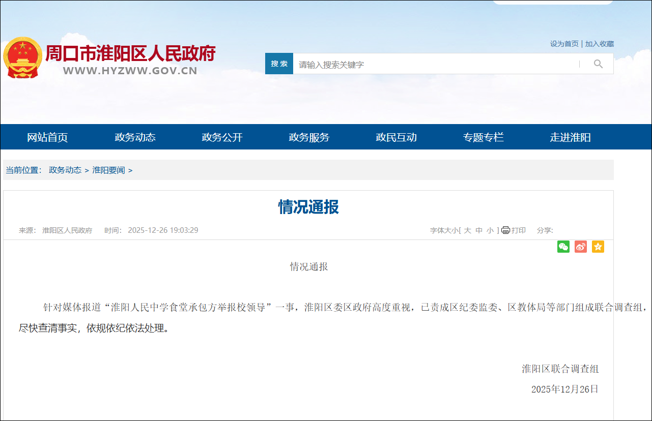 12月26日,淮阳区联合调查组发布情况通报:针对媒体报道“淮阳人民中学食堂承包方举报校领导”一事,淮阳区委区政府高度重视,已责成区纪委监委、区教体局等部门组成联合调查组,尽快查清事实,依规依纪依法处理。