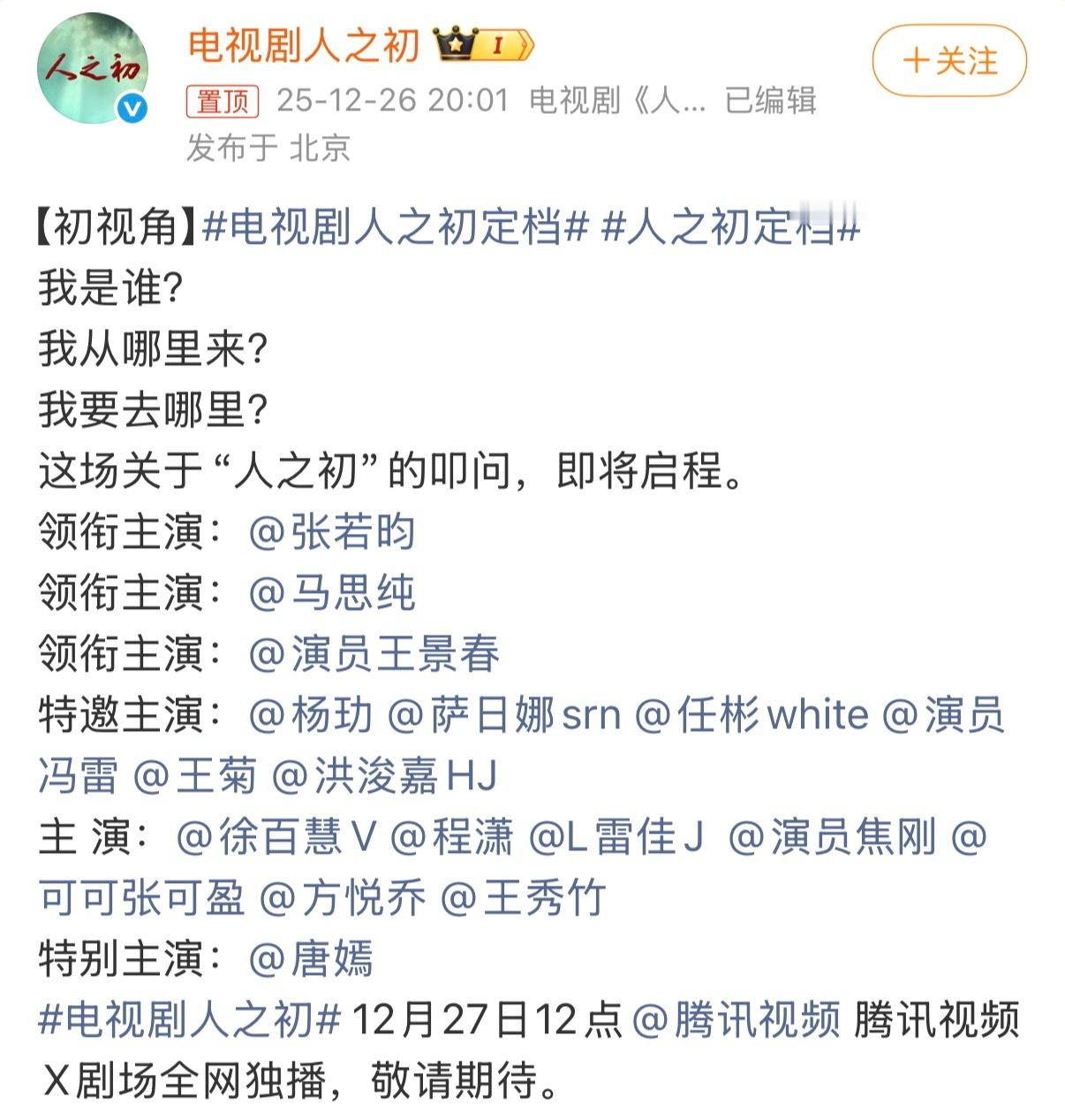 电视剧《人之初》定档12月27日开播,现在都流行晚上极限空降定档的。看追剧日历这么快单更,这种更新模式就是弃热度要拉新了。