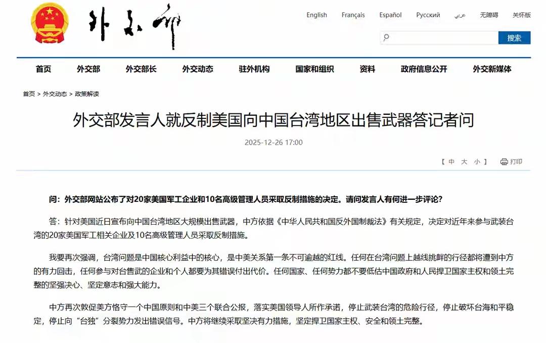 敢支持台独,可要赔上血本! 12月26日,中国外交部发布中方反制