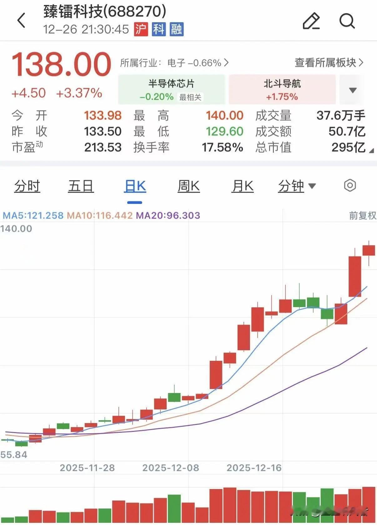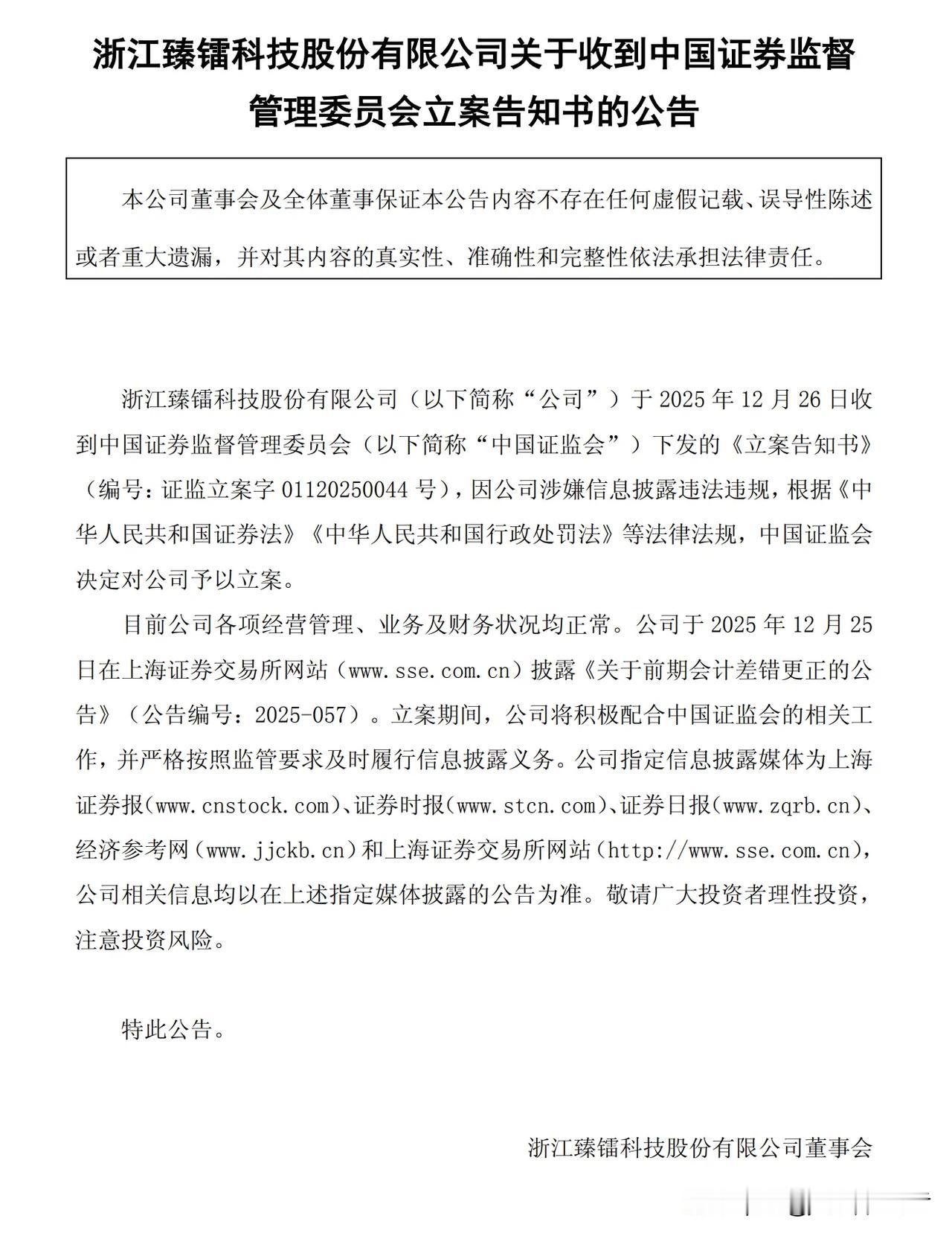 【商业航天大牛股突遭证监会立案!股价一月翻倍,今年已涨近3倍】 就在今天,一家近期火热的商业航天概念股——臻镭科技,突然发布了重磅公告。 公司称,收到了证监会的《立案告知书》,因涉嫌信息披露违法违规,被正式立案调查。公司同时表示,目前经营、业务和财务都正常,会积极配合调查。 这家公司到底是什么来头? 简单说,它主要做芯片和微系统。产品既用于数据链、电子对抗等特殊领域,也用在像卫星互联网、5G通信这些民用高科技行业。算是踩在了当前最热的“商业航天”和“高科技自主”的风口上。 正因为踩中了风口,它的股价近期堪称“火箭式”拉升。仅仅在12月这一个月,股价就暴涨了110%以上。如果把时间拉长到今年,累计涨幅更是超过290%,是今年不折不扣的大牛股之一。 今天收盘时,其股价停留在138元,公司总市值约295亿元。 证监会立案调查,对股价的影响有待后续观察。这也再次提醒各位投资者,在追逐热点、看好前景的同时,公司的规范运作和基本面永远是支撑价值的基石。投资需谨慎,注意风险。航天概念股