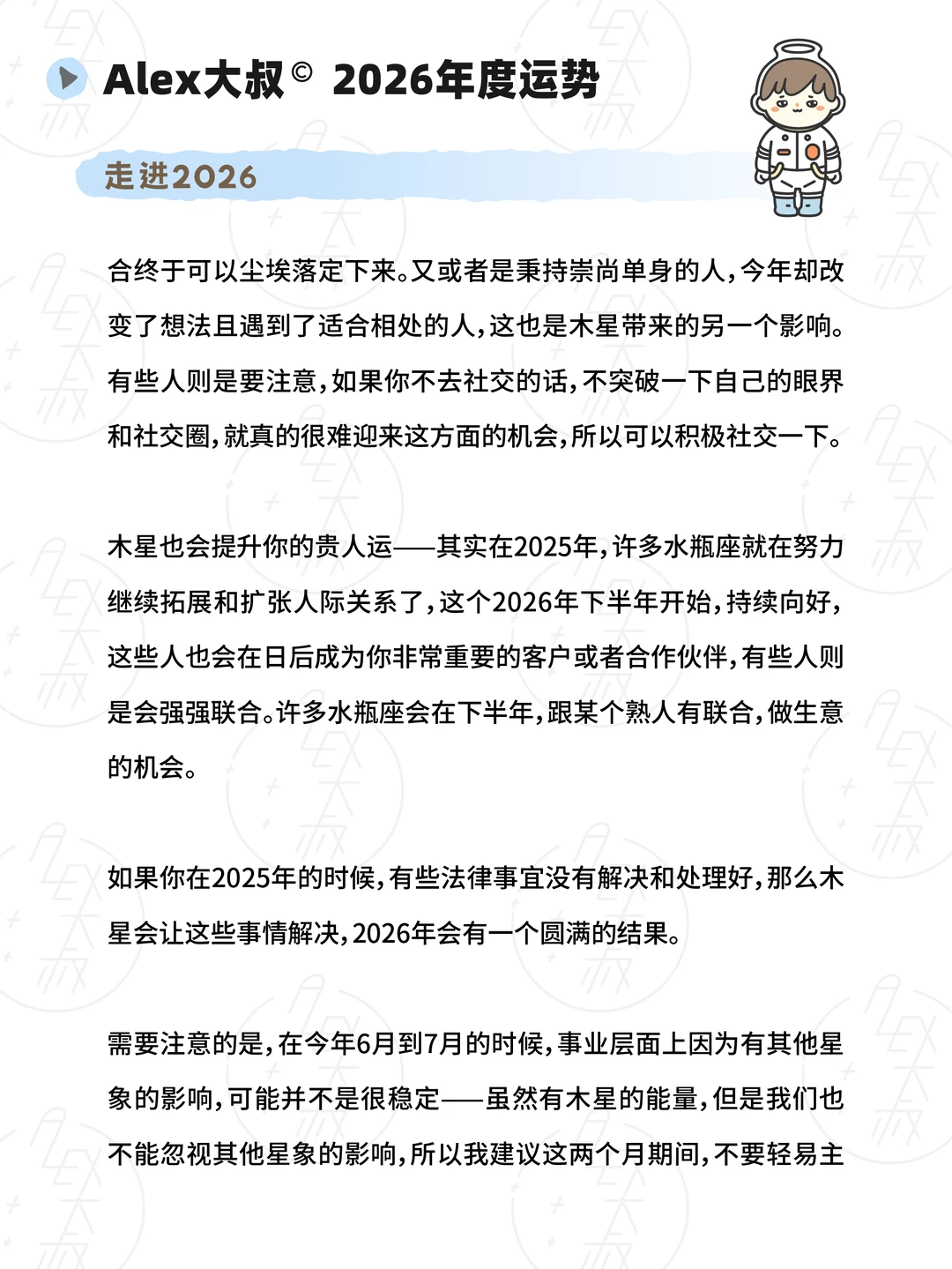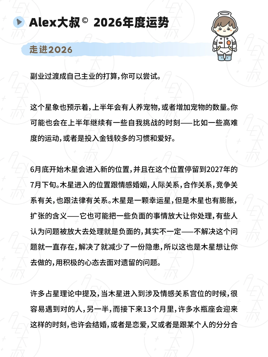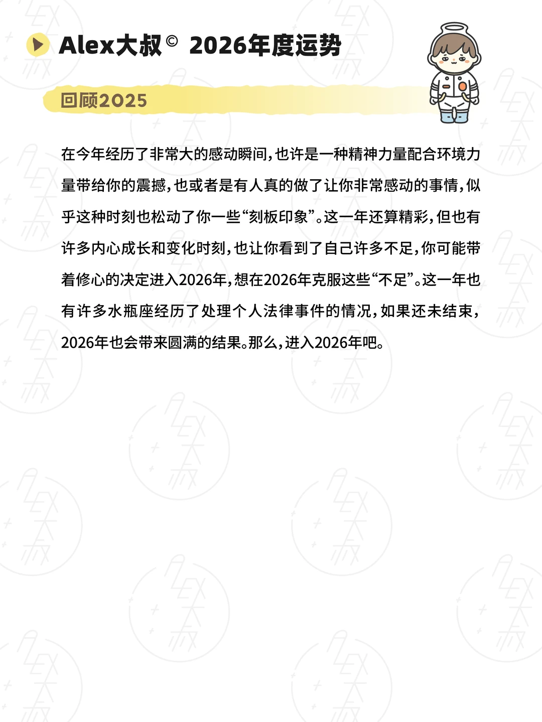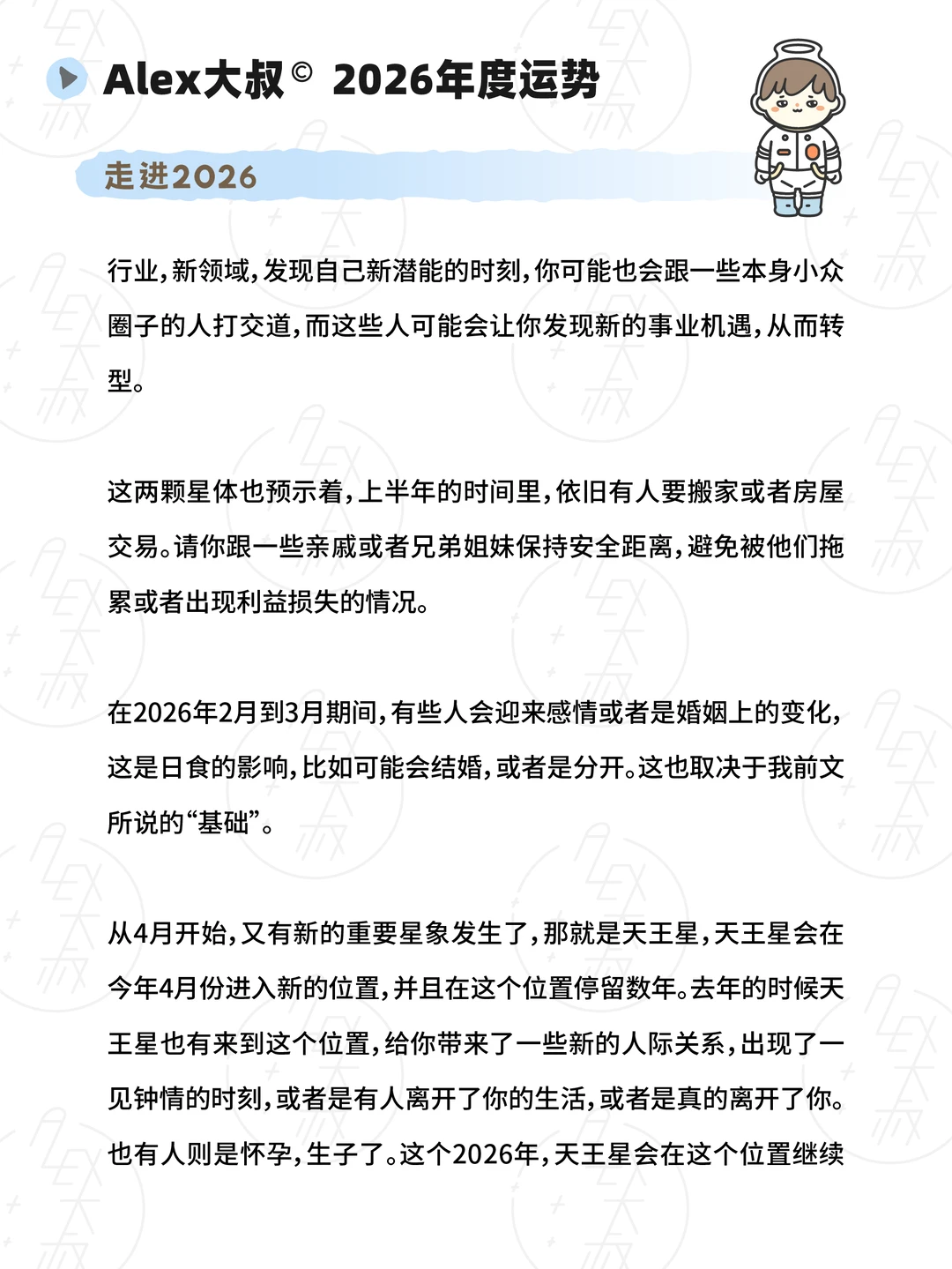 2026 年,该如何定义? 读者们往往只希望得到一个准确的答案:好,还是不好? 就像在日常被问到的——我的星座是好,还是不好? 无法回答。 因为任何人在每一年里,都有美满、幸福、光耀的时刻,也会有低落、消沉、挫败的瞬间。 没有哪年,能用单一状态去概括、去定性。但可以告诉你:2026 ,是一个提醒你——走稳了,再走远的年份。 重大星体将在 2026 年完成位移,并在全新的位置停留多年。而这些变化,其实早在 2025 年就提前显现。 这也是为什么,许多人会觉得 2025 年跌宕起伏、突变频繁,甚至有断崖式的事件,发生。正是在这样,很多人被迫“长大”,提前面对了一些原以为要在更晚阶段才会遇到的课题。 因为有 2025 的铺垫,才让我们意识到: 在 2026 里,靠意志力撑下去的生活,是走不远的。 我们必须用更成熟的方式,对待自己,也对待自己的人生。 很多人会以为,成长意味着忍耐、硬扛、不喊疼。 但2025 的经历已经告诉你——这种方式不成立。只会带来更多消耗,甚至影响健康。 如果你在 2025 ,因情绪和压力已经感受到身体的提醒,那么在 2026 ,是时候醒悟了。 成长,是承认现实;也是把力气,用在真正重要的地方。 有些关系,会走到尽头; 有些方向,要重新规划; 有些人,会从你的生活退场。 这些不是失败。 只是这段路,走完了。下一段旅程,正开始。 我们往往会在不顺利的时候放大委屈,反复问:为什么? 但换一个角度: 也许正是因为你有能力去解决、去超越,这个考验才会出现。 回头看一看——是不是每一次挫折,你最终都挺了过来? 在写这次年运的时候,有一个强烈的感受: 这一年,将是一场集体必须面对的课题。 每个人都会在时代的前进与筛选之中,寻找并建立起更稳定的生命力。 只要你愿意走,就不会有白走的路径。 不必刻意追求完美,你只需变得更真实、更稳固,走得更远就好。 希望这段前言,能在你读年运前,为你带来稳定的心态,也为你面对新的一年、未来的人生,留下灵感与创造力。 年末,开心的事,值得认真总结; 不开心的事,就让它了结。 Ps: 大众运势无法对应到每个人,这是它的局限。我无法成为所谓的“指路明灯”。但如果年运的这些只言片语,能在某些时刻让你感受到共鸣、获得启发,并更好地生活在当下与未来,那么它的意义,已经足够。 最后,感谢我们彼此——又一年无形的约定与陪伴。祝你 2026 年,加油。