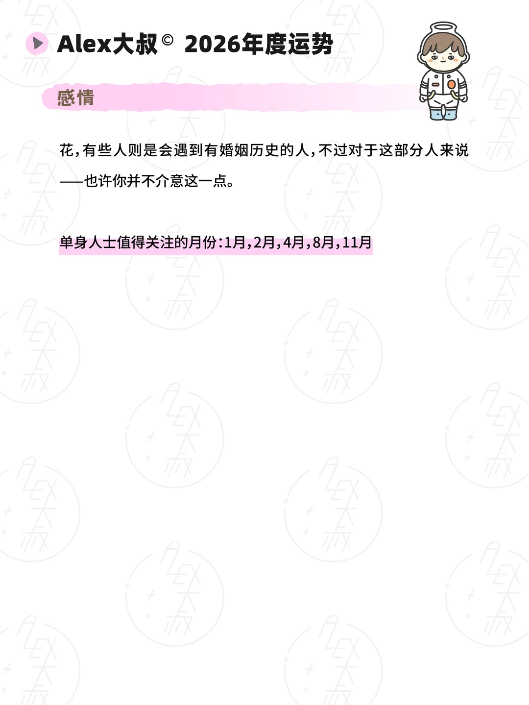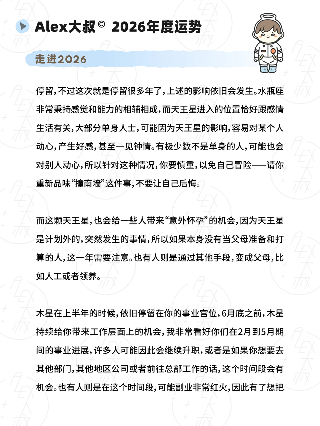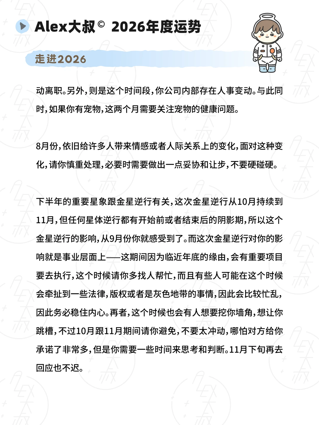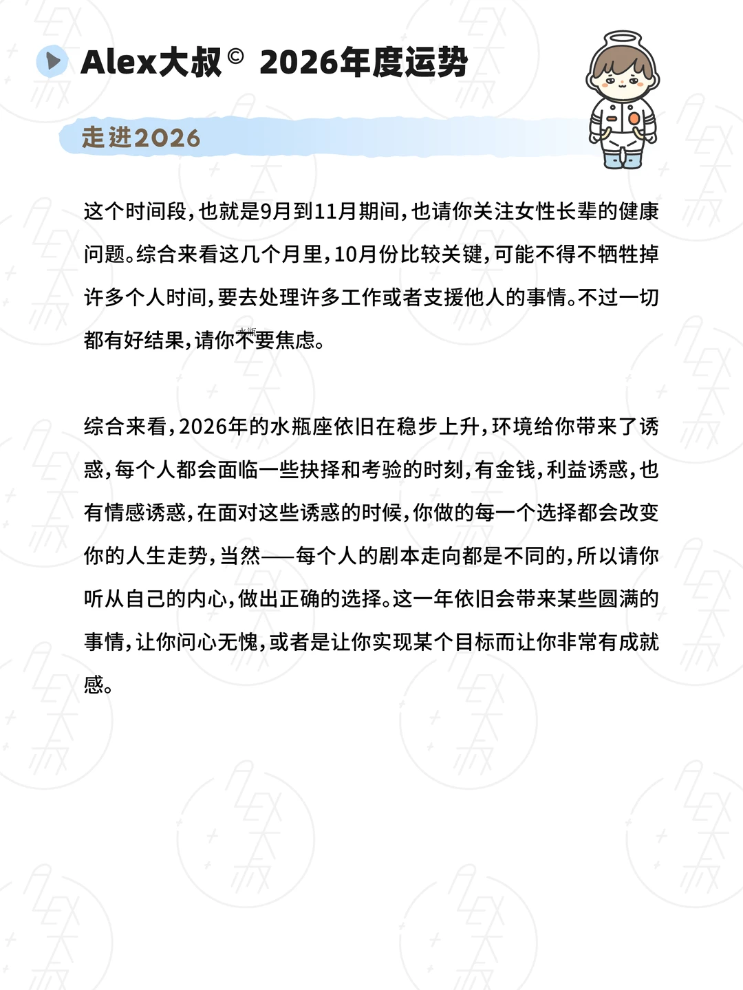 2026 年,该如何定义? 读者们往往只希望得到一个准确的答案:好,还是不好? 就像在日常被问到的——我的星座是好,还是不好? 无法回答。 因为任何人在每一年里,都有美满、幸福、光耀的时刻,也会有低落、消沉、挫败的瞬间。 没有哪年,能用单一状态去概括、去定性。但可以告诉你:2026 ,是一个提醒你——走稳了,再走远的年份。 重大星体将在 2026 年完成位移,并在全新的位置停留多年。而这些变化,其实早在 2025 年就提前显现。 这也是为什么,许多人会觉得 2025 年跌宕起伏、突变频繁,甚至有断崖式的事件,发生。正是在这样,很多人被迫“长大”,提前面对了一些原以为要在更晚阶段才会遇到的课题。 因为有 2025 的铺垫,才让我们意识到: 在 2026 里,靠意志力撑下去的生活,是走不远的。 我们必须用更成熟的方式,对待自己,也对待自己的人生。 很多人会以为,成长意味着忍耐、硬扛、不喊疼。 但2025 的经历已经告诉你——这种方式不成立。只会带来更多消耗,甚至影响健康。 如果你在 2025 ,因情绪和压力已经感受到身体的提醒,那么在 2026 ,是时候醒悟了。 成长,是承认现实;也是把力气,用在真正重要的地方。 有些关系,会走到尽头; 有些方向,要重新规划; 有些人,会从你的生活退场。 这些不是失败。 只是这段路,走完了。下一段旅程,正开始。 我们往往会在不顺利的时候放大委屈,反复问:为什么? 但换一个角度: 也许正是因为你有能力去解决、去超越,这个考验才会出现。 回头看一看——是不是每一次挫折,你最终都挺了过来? 在写这次年运的时候,有一个强烈的感受: 这一年,将是一场集体必须面对的课题。 每个人都会在时代的前进与筛选之中,寻找并建立起更稳定的生命力。 只要你愿意走,就不会有白走的路径。 不必刻意追求完美,你只需变得更真实、更稳固,走得更远就好。 希望这段前言,能在你读年运前,为你带来稳定的心态,也为你面对新的一年、未来的人生,留下灵感与创造力。 年末,开心的事,值得认真总结; 不开心的事,就让它了结。 Ps: 大众运势无法对应到每个人,这是它的局限。我无法成为所谓的“指路明灯”。但如果年运的这些只言片语,能在某些时刻让你感受到共鸣、获得启发,并更好地生活在当下与未来,那么它的意义,已经足够。 最后,感谢我们彼此——又一年无形的约定与陪伴。祝你 2026 年,加油。