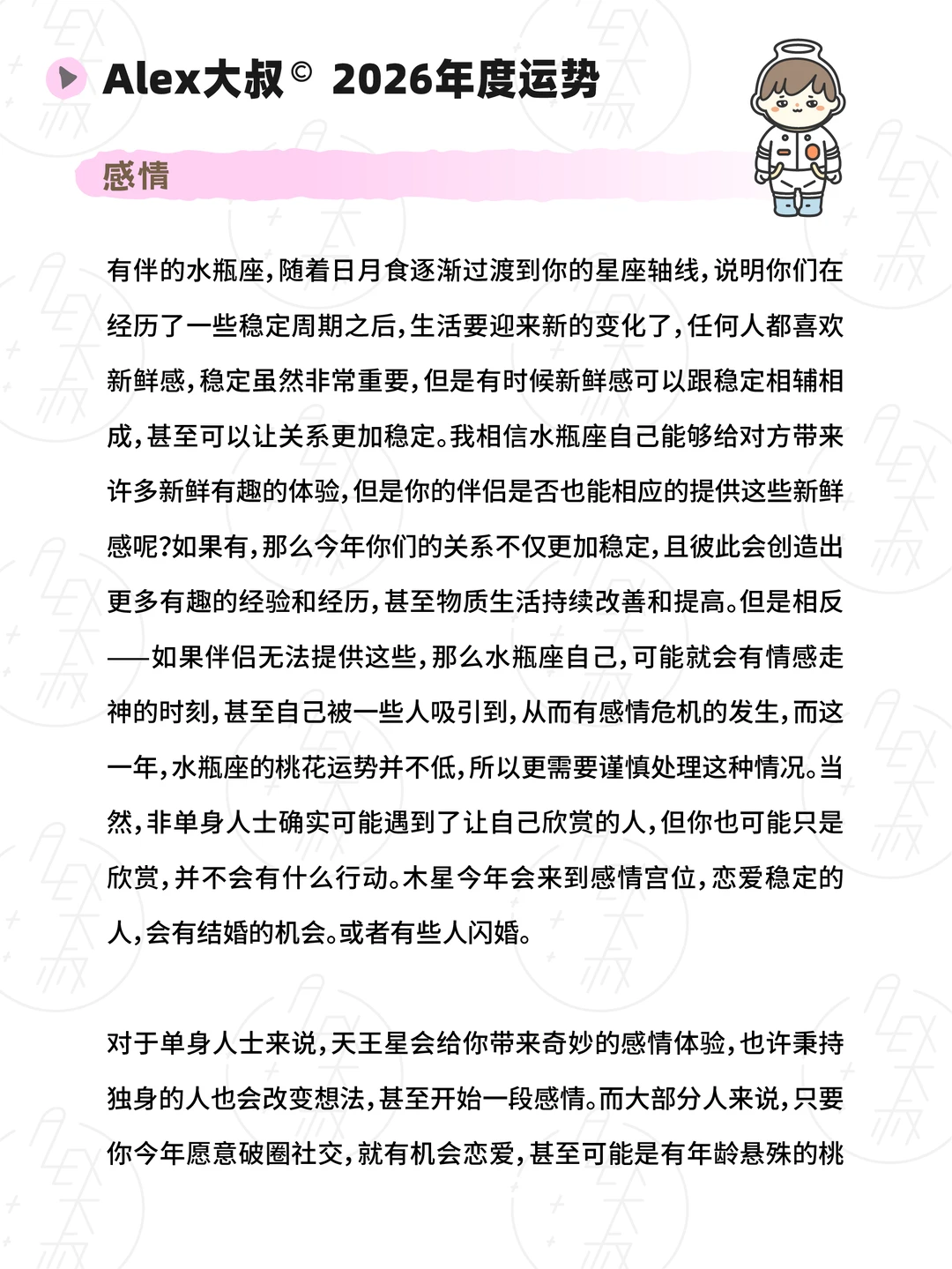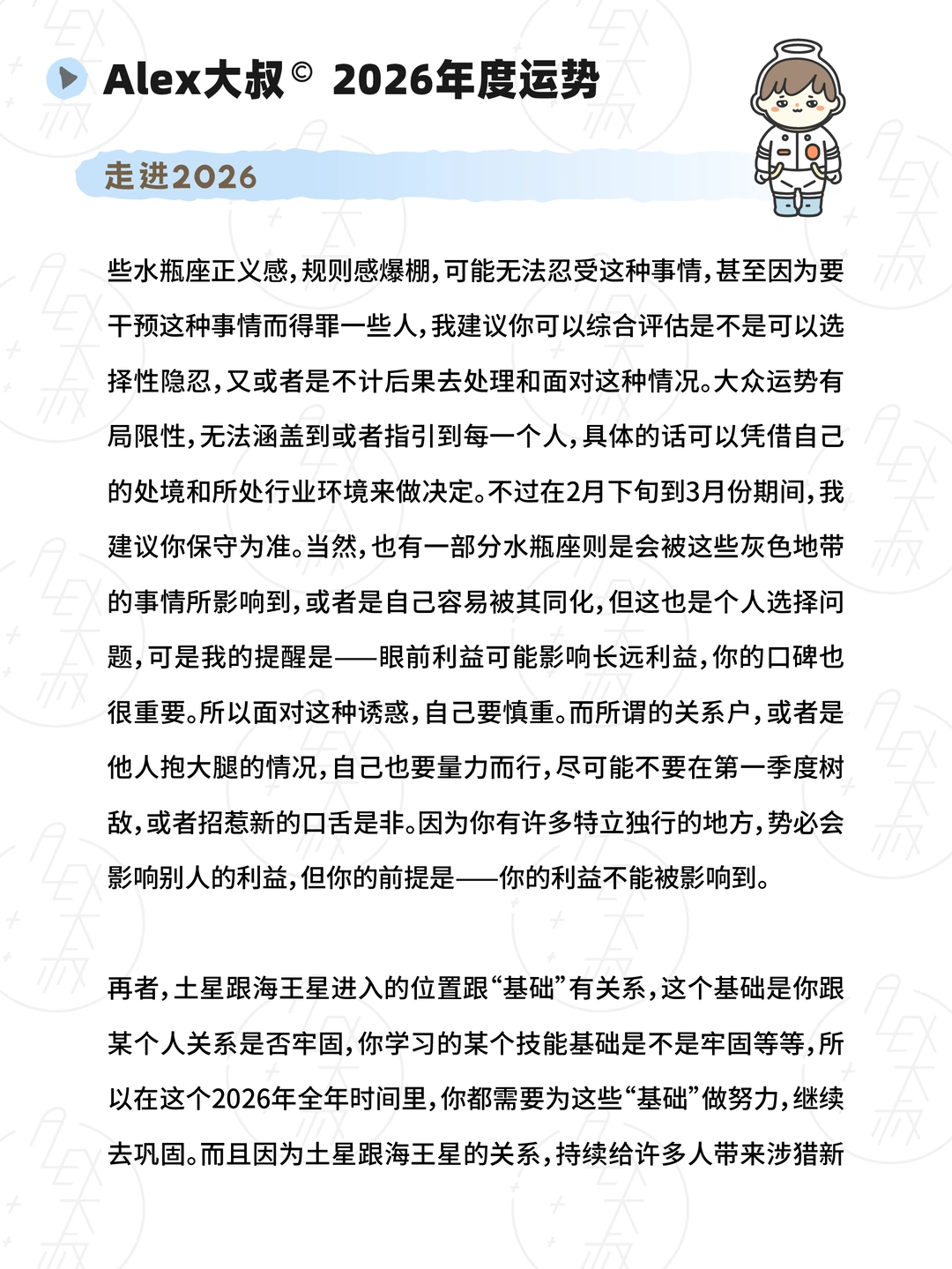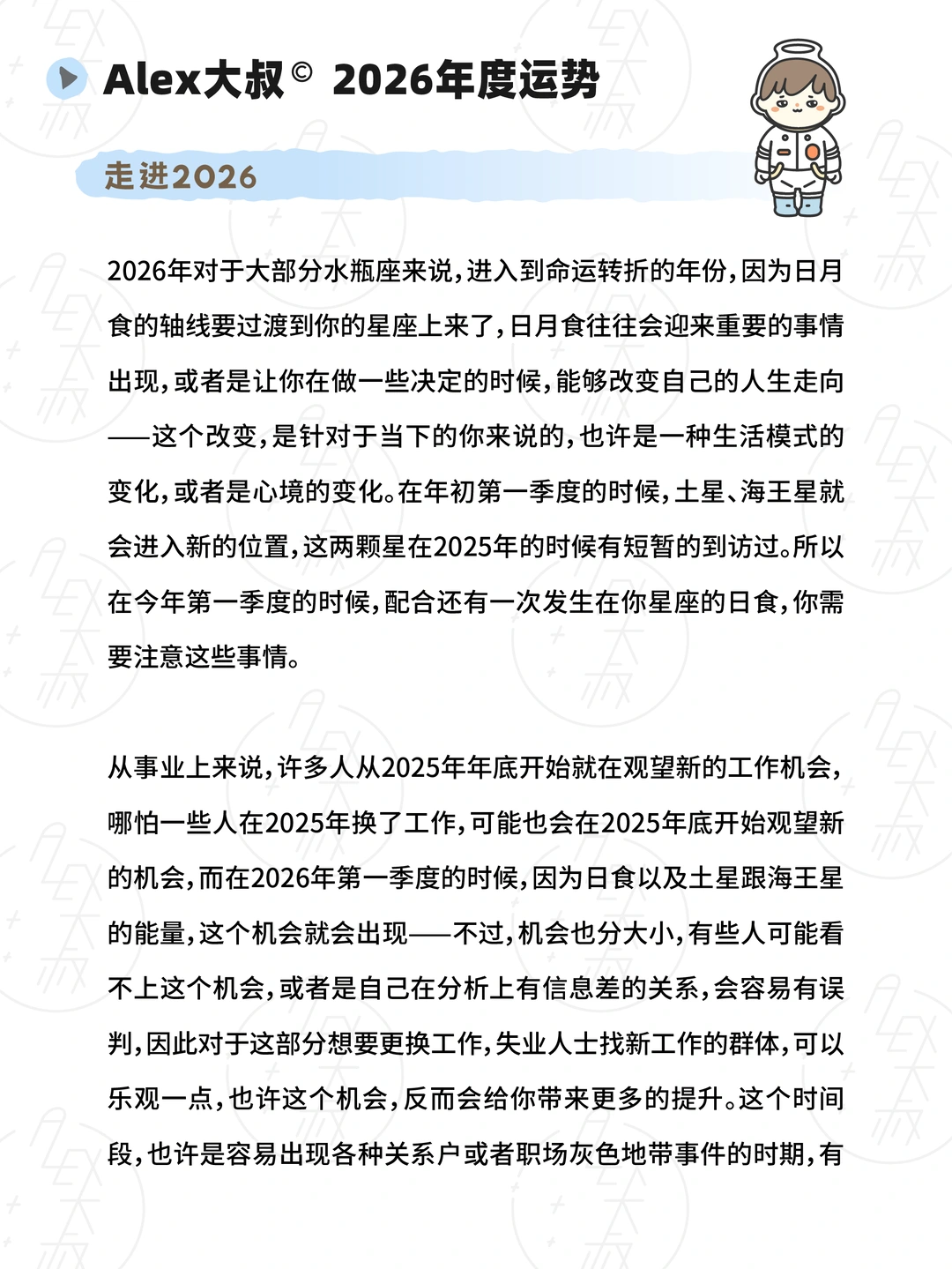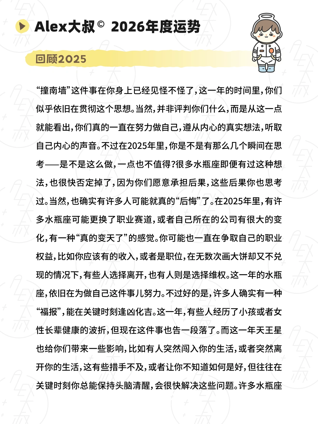 2026 年,该如何定义? 读者们往往只希望得到一个准确的答案:好,还是不好? 就像在日常被问到的——我的星座是好,还是不好? 无法回答。 因为任何人在每一年里,都有美满、幸福、光耀的时刻,也会有低落、消沉、挫败的瞬间。 没有哪年,能用单一状态去概括、去定性。但可以告诉你:2026 ,是一个提醒你——走稳了,再走远的年份。 重大星体将在 2026 年完成位移,并在全新的位置停留多年。而这些变化,其实早在 2025 年就提前显现。 这也是为什么,许多人会觉得 2025 年跌宕起伏、突变频繁,甚至有断崖式的事件,发生。正是在这样,很多人被迫“长大”,提前面对了一些原以为要在更晚阶段才会遇到的课题。 因为有 2025 的铺垫,才让我们意识到: 在 2026 里,靠意志力撑下去的生活,是走不远的。 我们必须用更成熟的方式,对待自己,也对待自己的人生。 很多人会以为,成长意味着忍耐、硬扛、不喊疼。 但2025 的经历已经告诉你——这种方式不成立。只会带来更多消耗,甚至影响健康。 如果你在 2025 ,因情绪和压力已经感受到身体的提醒,那么在 2026 ,是时候醒悟了。 成长,是承认现实;也是把力气,用在真正重要的地方。 有些关系,会走到尽头; 有些方向,要重新规划; 有些人,会从你的生活退场。 这些不是失败。 只是这段路,走完了。下一段旅程,正开始。 我们往往会在不顺利的时候放大委屈,反复问:为什么? 但换一个角度: 也许正是因为你有能力去解决、去超越,这个考验才会出现。 回头看一看——是不是每一次挫折,你最终都挺了过来? 在写这次年运的时候,有一个强烈的感受: 这一年,将是一场集体必须面对的课题。 每个人都会在时代的前进与筛选之中,寻找并建立起更稳定的生命力。 只要你愿意走,就不会有白走的路径。 不必刻意追求完美,你只需变得更真实、更稳固,走得更远就好。 希望这段前言,能在你读年运前,为你带来稳定的心态,也为你面对新的一年、未来的人生,留下灵感与创造力。 年末,开心的事,值得认真总结; 不开心的事,就让它了结。 Ps: 大众运势无法对应到每个人,这是它的局限。我无法成为所谓的“指路明灯”。但如果年运的这些只言片语,能在某些时刻让你感受到共鸣、获得启发,并更好地生活在当下与未来,那么它的意义,已经足够。 最后,感谢我们彼此——又一年无形的约定与陪伴。祝你 2026 年,加油。