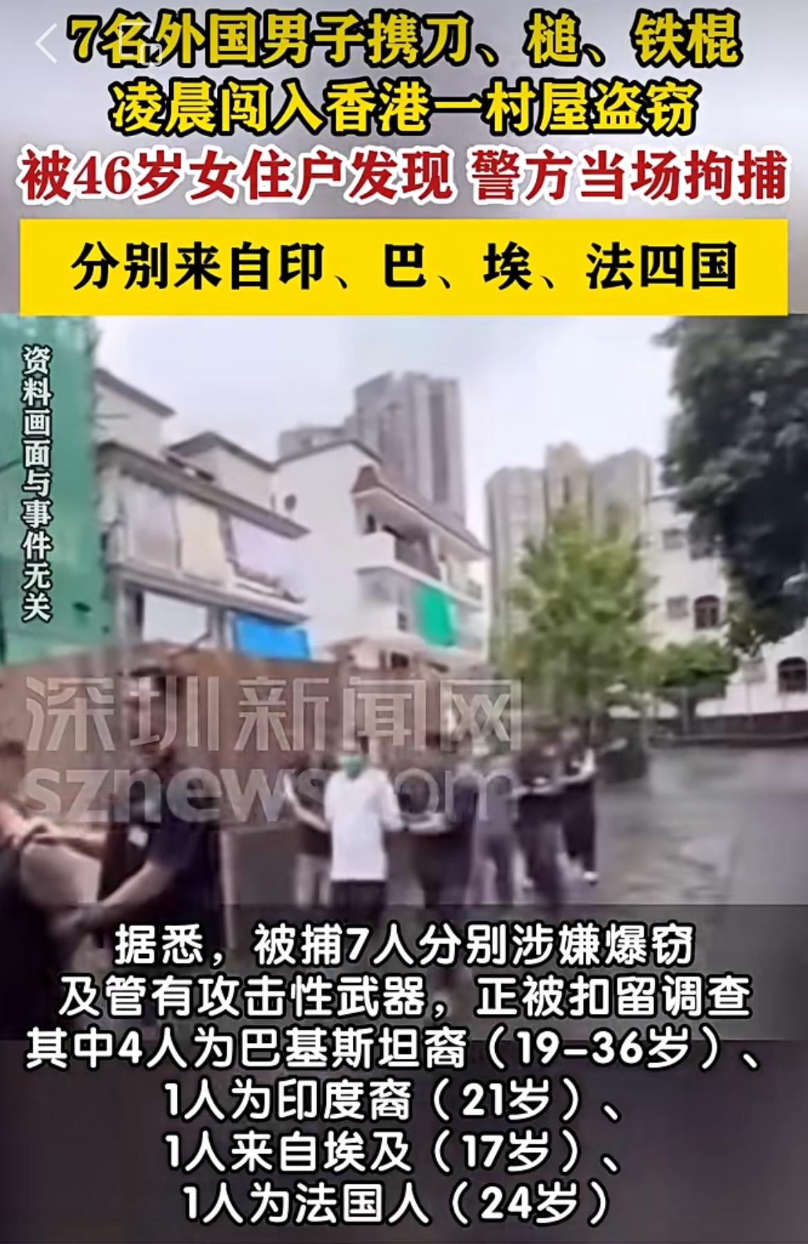 4名巴基斯坦、1名印度、1名埃及、1名法国男子组团香港盗窃。12月20日晚,这伙人驾车窜入元朗一城中村的房子,窃得金戒指、项链及人民币现金,准备逃离时被事主发现报警。警察赶到后追踪嫌疑车辆,悉数被抓获,缴获价值2万的赃物,在车上搜到作案的刀具等凶器。香港抢劫 香港黄金抢劫案