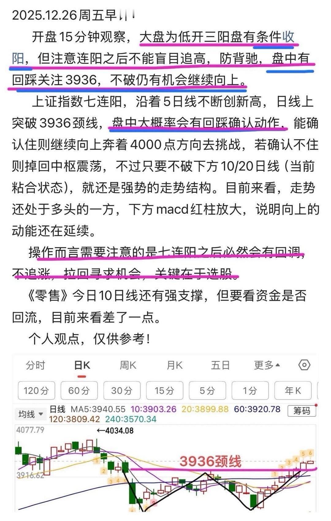 午盘突发跳水,就问你慌不?看懂走势结构比什么都重要。今天大盘总体走势还是符合早评预期,依旧收阳盘,盘中回踩3936确认,不破3936继续向上,所以走势结构还是比较清晰的,你要知道关键点在哪里,你就不会慌乱,知道什么样的走势意味着什么,今天跳水不就是一个盘中回踩确认的动作嘛?短线来看,八连阳,指数还是比较强的,能不能练成九阳神功?关注收评!