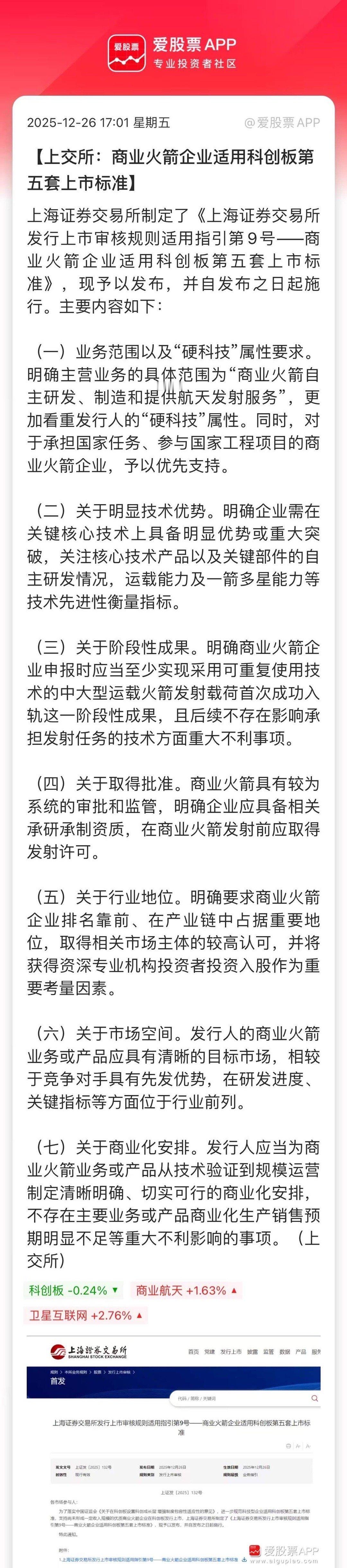 上交所又给商业航天带货了,商业火箭企业适用科创板第五套上市标准。意味着亏损企业可以上市,跟摩尔线程、沐曦股份待遇一样了!目前看,蓝箭航天已经完成IPO辅导,有望成为第一家冲刺A股上市的。蓝箭航天的“朱雀三号”已经完成国内首飞尝试一级火箭回收,虽说失利,但实现了多项技术突破。总之,商业航天公司IPO窗口打开,蓝箭航天、中科宇航、天兵科技、星河动力都在排队,这又是一场资本市场超级盛宴!要知道如果SpaceX登陆美股,市值估计给到1万亿美元;中国的SpaceX们不得值2000、3000亿人民币啊!就像摩尔线程、沐曦,在一级市场就值200、300亿;上市后就是3000、4000亿了。这是最好的时代,国家支持的新兴行业能大量创富;这是最差的时代,很多老登行业没人理,拿着老登股的也只能暗自伤神了。