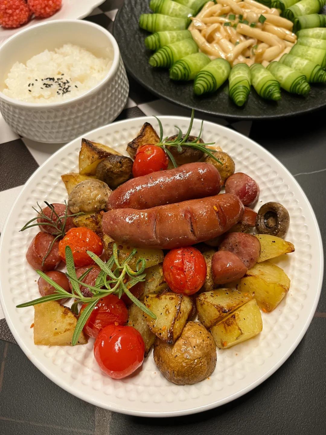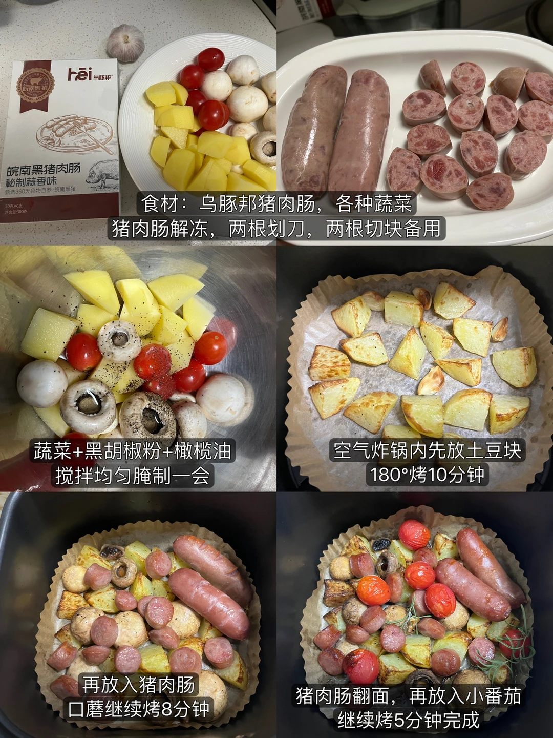 【🥢空气炸锅版时蔬烤肉肠】做法简单,蔬菜随意添加,烤的时候需要注意温度分批次烤制。乌豚邦皖南黑猪肉肠是我家常备的,精选肉质配料干净,90%含肉量,没有科技与狠活,是我完全放心给我儿子吃的烤肠~有时候早餐也会煎两根来吃,鲜香可口,很推荐~