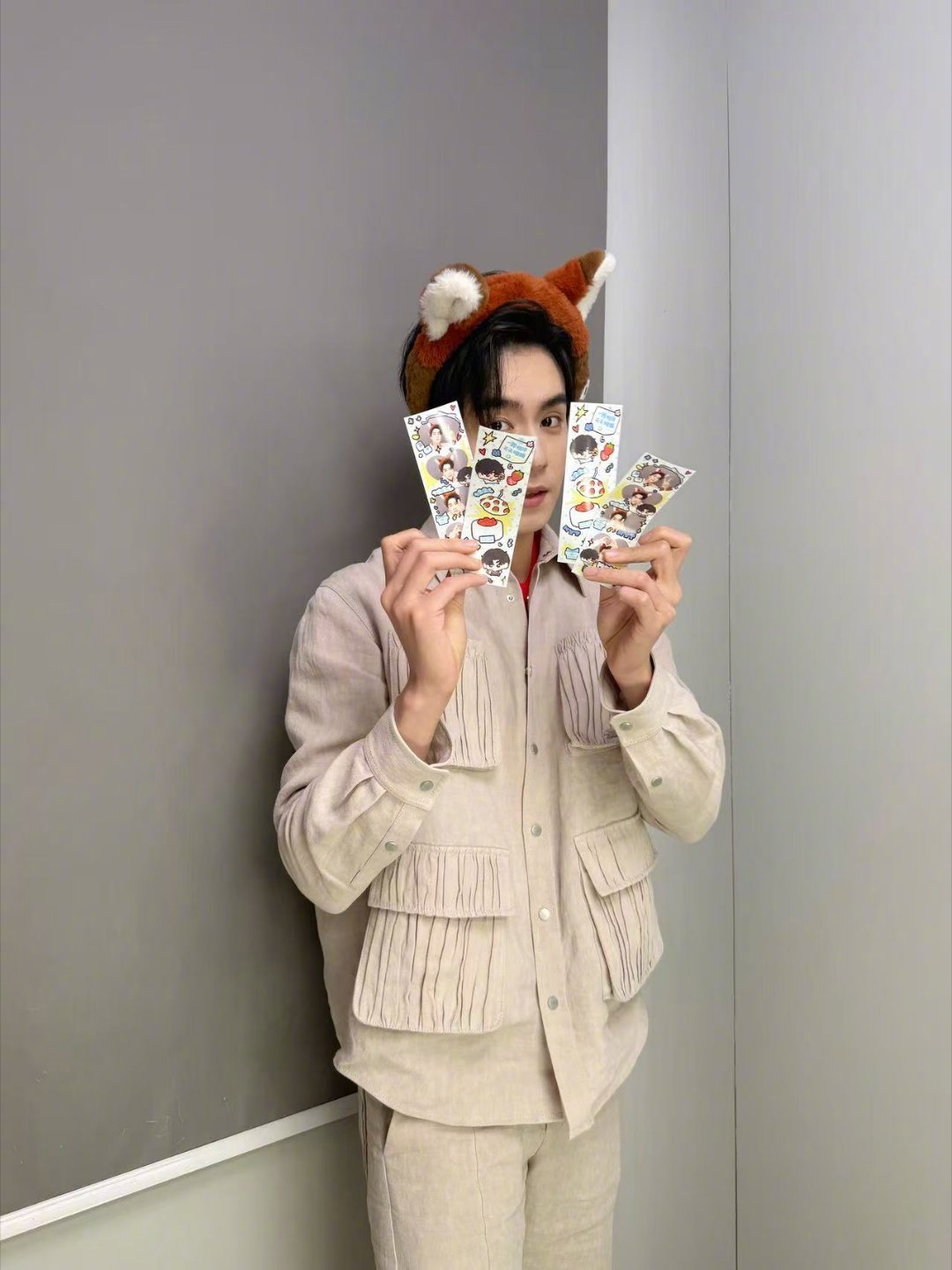 胡一天逆应援打卡粉丝同款大头贴 别的粉丝打卡偶像同款,胡一天反向打卡粉丝同款头戴狐狸耳朵发卡拍大头贴+1,今日份的可爱超标了!