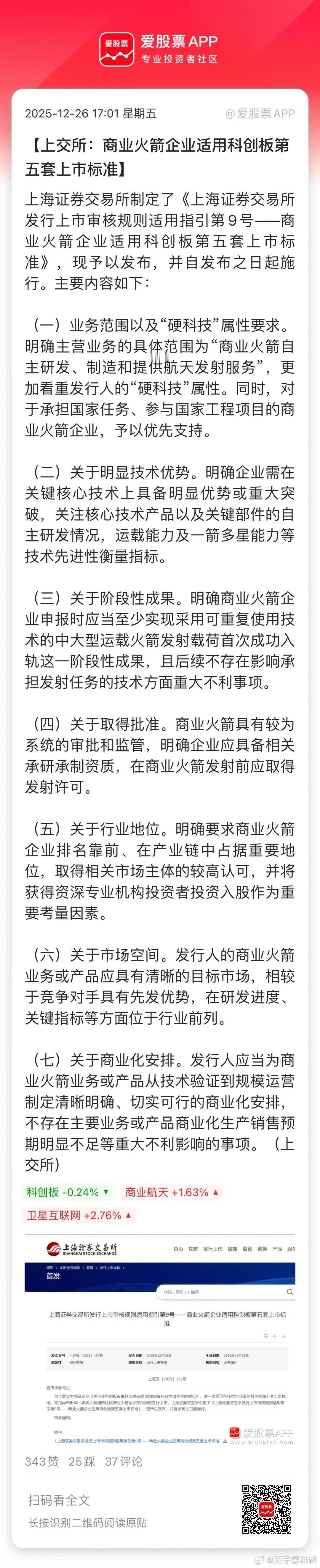 上交所又给商业航天带货了,商业火箭企业适用科创板第五套上市标准。意味着亏损企业可以上市,跟摩尔线程、沐曦股份待遇一样了!目前看,蓝箭航天已经完成IPO辅导,有望成为第一家冲刺A股上市的。蓝箭航天的“朱雀三号”已经完成国内首飞尝试一级火箭回收,虽说失利,但实现了多项技术突破。总之,商业航天公司IPO窗口打开,蓝箭航天、中科宇航、天兵科技、星河动力都在排队,这又是一场资本市场超级盛宴!要知道如果SpaceX登陆美股,市值估计给到1万亿美元;中国的SpaceX们不得值2000、3000亿人民币啊!就像摩尔线程、沐曦,在一级市场就值200、300亿;上市后就是3000、4000亿了。这是最好的时代,国家支持的新兴行业能大量创富;这是最差的时代,很多老登行业没人理,拿着老登股的也只能暗自伤神了。
