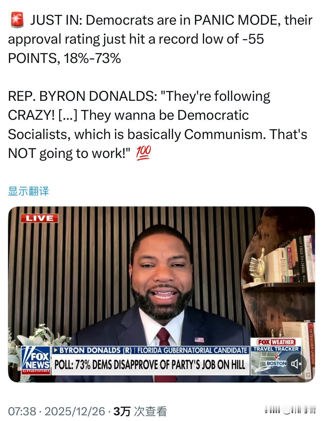 最新消息:民主党人陷入恐慌,他们的支持率刚刚跌至历史新低,18%的支持率和-55%的净支持率。 根据昆尼皮亚克大学 (Quinnipiac University)于2025年12月17日发布的民调,国会民主党人的工作支持率确实跌至了18%的历史新低。