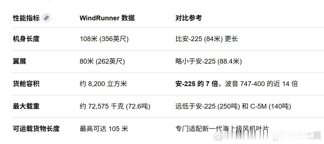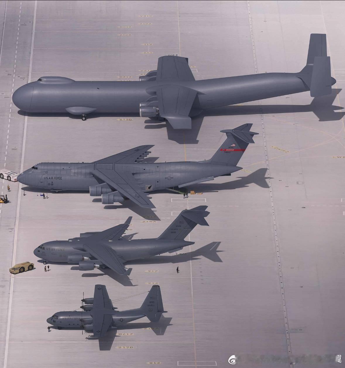 WindRunner超大尺寸运输机尺寸对比。航空创作计划WindRunner是由美国初创公司Radia开发的一种超大型运输机,原被设计为史上尺寸最大的飞机,主要用于解决超大型风电叶片的陆路运输难题。2025年9月,Radia宣布与美国国防部合作开发军用型号。美军看中其超大容积,可用于一次性运输多架直升机(如6架支奴干)或无需拆卸的大型雷达和高超音速导弹系统。WindRunner的设计重点在于“超大货舱容积”而非“极端载重能力”,其尺寸超越了已毁的安-225。