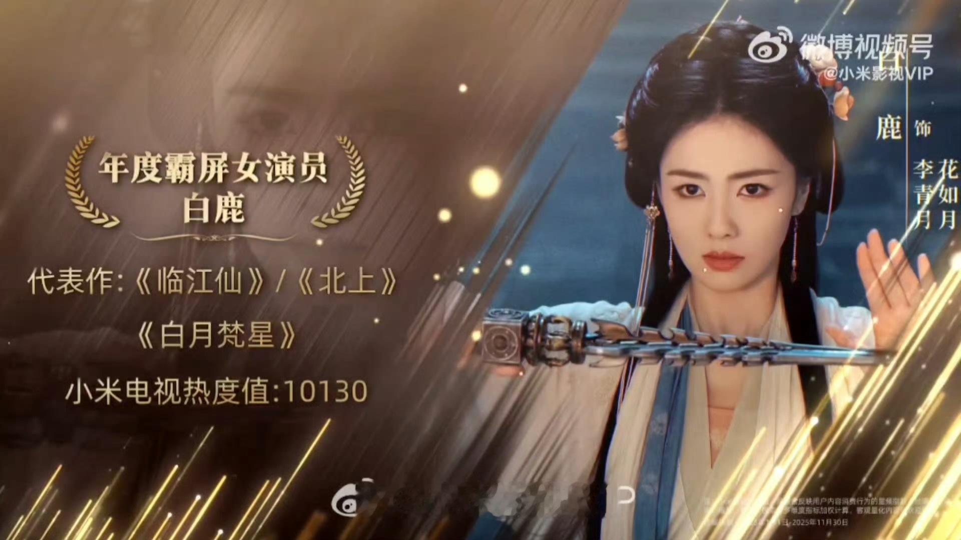 小米电视2025年度榜单 白鹿获得年度霸屏女演员用户重复播放影视节目TOP3 白鹿《白月梵星》