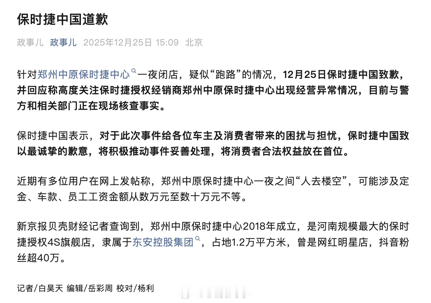 哎,到年底了又有经销商跑路了从目前的信息来看,郑州/贵阳两家保时捷已经是提前跑路,人去楼空了。那问题来了:车主交了定金的,还没提车的,怎么办?