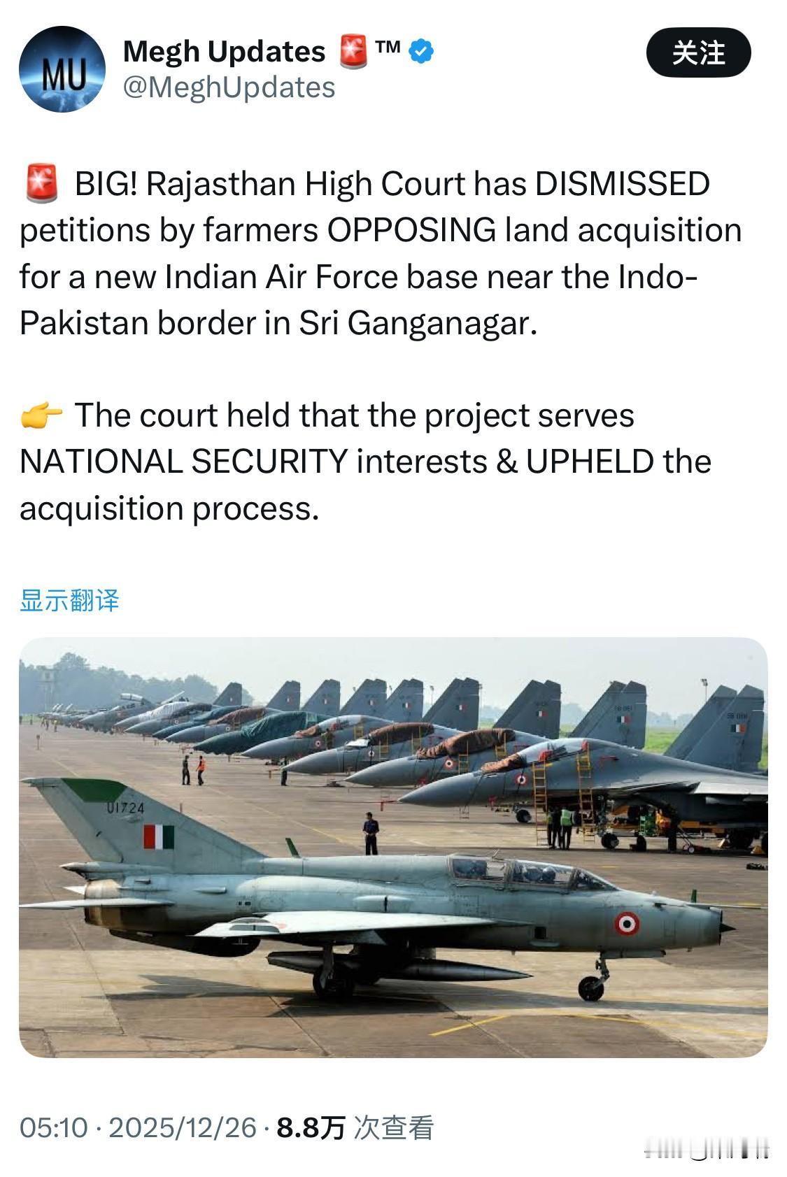 印度拉贾斯坦邦高等法院已批准印度空军在斯里格根加讷尔(Sri Ganganagar)附近征用土地建设新基地的请求。法院驳回了受影响农民提出的反对征地请求,理由是该项目符合国家安全利益,公共利益优先于个人利益。 裁决详情 项目名称: 该项目是一个名为“前方复合航空基地(FCAB)”的战略防御项目,代号为“辛杜尔行动(Operation Sindoor)”。 战略位置: 新的 Sadulshahar 航空基地距巴基斯坦边境仅约 40 公里。这将是斯里格根加讷尔地区的第二个空军基地,显著增强印度空军沿西部边境的快速反应和空中优势能力。 法律依据: 高等法院的 Nupur Bhati 法官强调,涉及国家安全的项目,国家利益优先于个人困难。法院审查了官方记录,认定所有法定程序,包括社会影响评估、听证会和安置计划,都已严格遵守。 农民反对: 共有58名农民提交了请愿书,声称征地过程中未遵守《2013年土地征用法案》,社会影响评估存在偏见,且补偿低于市场价。法院驳回了这些请愿,称其为“意图阻挠合法征地程序的无理取闹”。