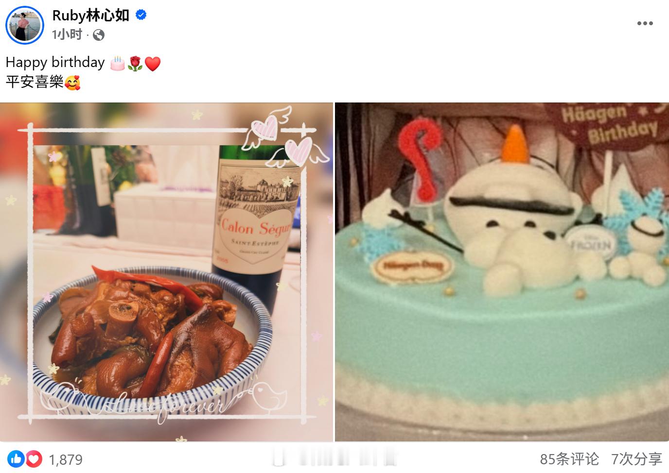 林心如卤猪脚为46岁霍建华庆生霍建华过46岁生日,林心如亲自下厨做卤猪脚庆生!铁粉夸林心如卤猪脚做的好,林心如亲回戴上墨镜的表情符号,像是自豪自己的厨艺!今(26日)是霍建华46岁生日,林心如在脸书分享亲自卤的猪脚和插着问号的生日蛋糕照片,写下「Happy birthday平安喜乐。